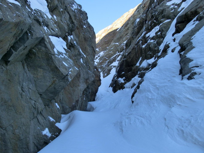 Super! zunächst harte morgendliche Abfahrt von der Hütte hinunter zum Gurgler Bach; dann ohne Probleme (bis auf eine etwas eisige steilere Stelle) durch die Schlucht zum Gletschertor des Gurgler Ferners; gute Spur über den Gurgler und Kleinleiten Ferner ins Schalfjoch, dann kurze Stelle am Grat die Ski tragen, dann den Grat entlang zum Gipfel; Abfahrt auf der Route des Aufstiegs: sehr guter Pulver und noch wenig Spuren! auf dem Gurgler Ferner stark windverpresst; Schlucht kein Problem;