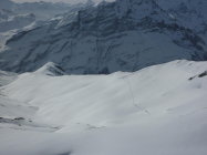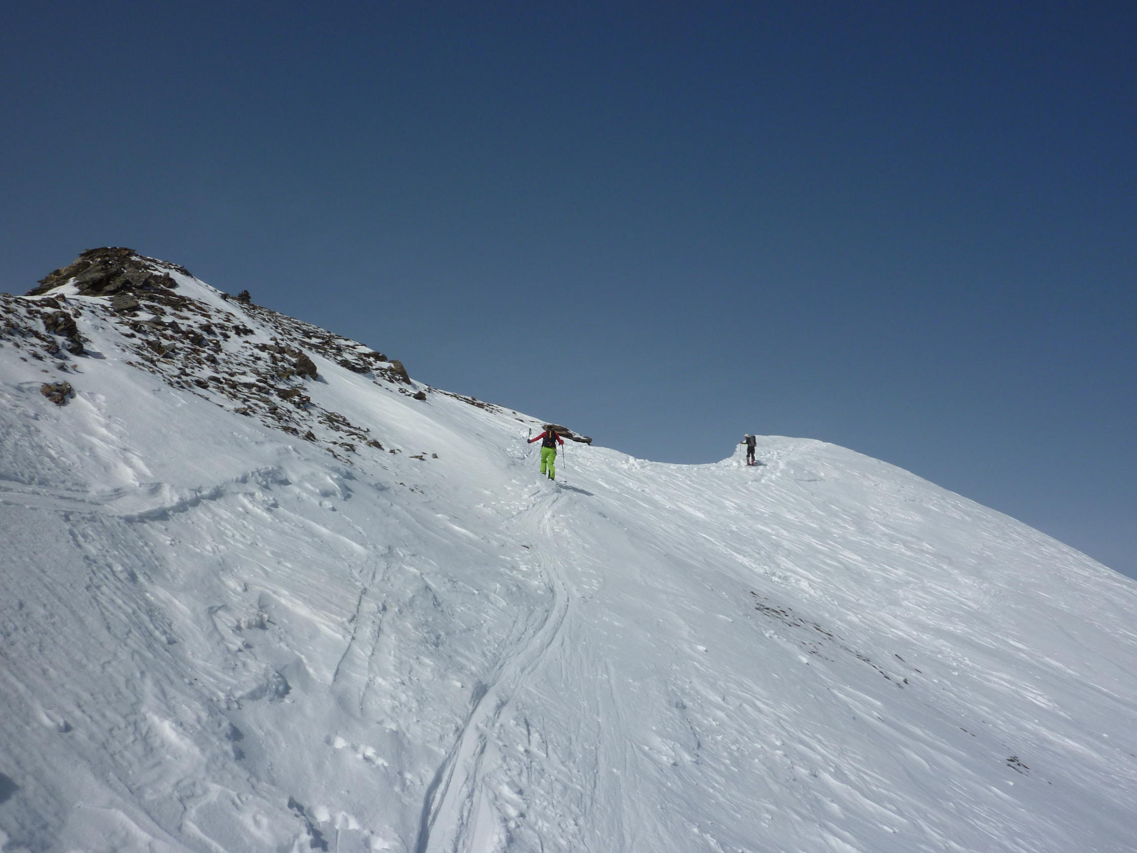 Ideale Verhältnisse, wenn man früh startet. Heute gegen 7:20 MESZ, gut gefrorene Schneedecke, (noch) durchgehend Schnee ab Nufenen. Ab der Einquerung ins Butzner Täli etwas Spurarbeit in sehr kompaktem Pulver, südostgerichtete Mulden schon pappig, Hang vor dem Joch noch kompakt, griffig, nur die allerletzten Meter etwas eisig. Gipfelgrat windgepresst, griffig. Abfahrt um 11:20 MESZ Gipfelhang oberer Teil Bruch, ab der Mitte Pulver. Südseitig dann bester Firn bis etwa 2200m. Dann schwerer werdend, aber immer noch gut fahrbar bis Nufenen.