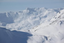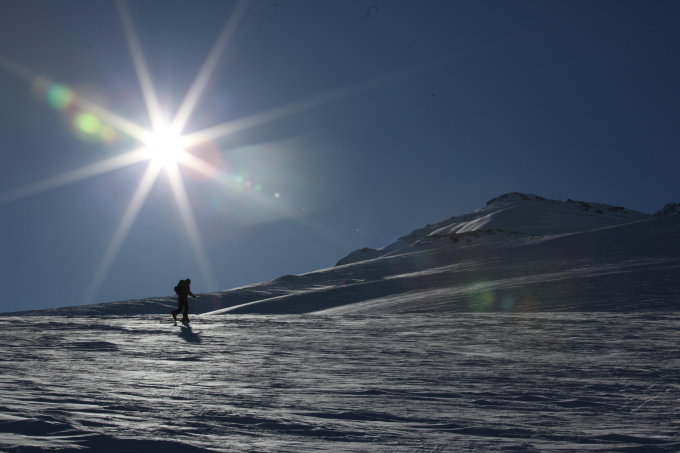 Vom Joch zunächst MIT Ski in die Ostflanke, trotzdem eingesunken bis über die Knie (zu Fuß keine Chance). Später dann doch zu Fuß in alter halb zugewehter Spur Wühlerei vom Feinsten bis auf den Grat kurz unterm Gipfel, kurzes Gratstück selbst hat gute Spur bis zum Gipfel.
