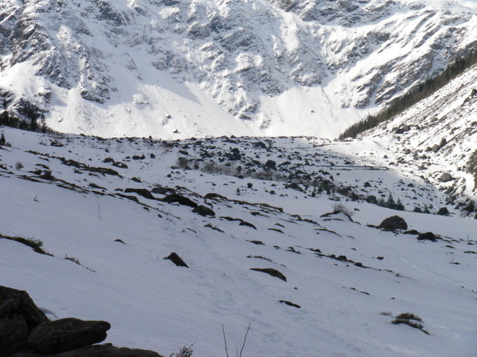 Abfahrt über Tentiwang, nicht empfehlenswert, da noch im Schatten, alles hart gefroren und Schnee umgeackert. Besser kurz zur Friodolinshütte traversieren und dort runter, sicher besser aufgesulzt.