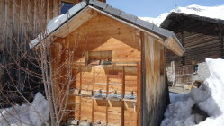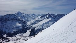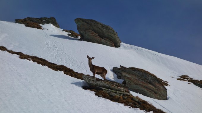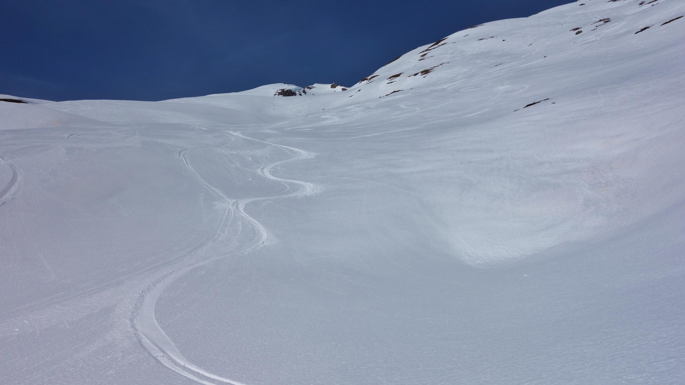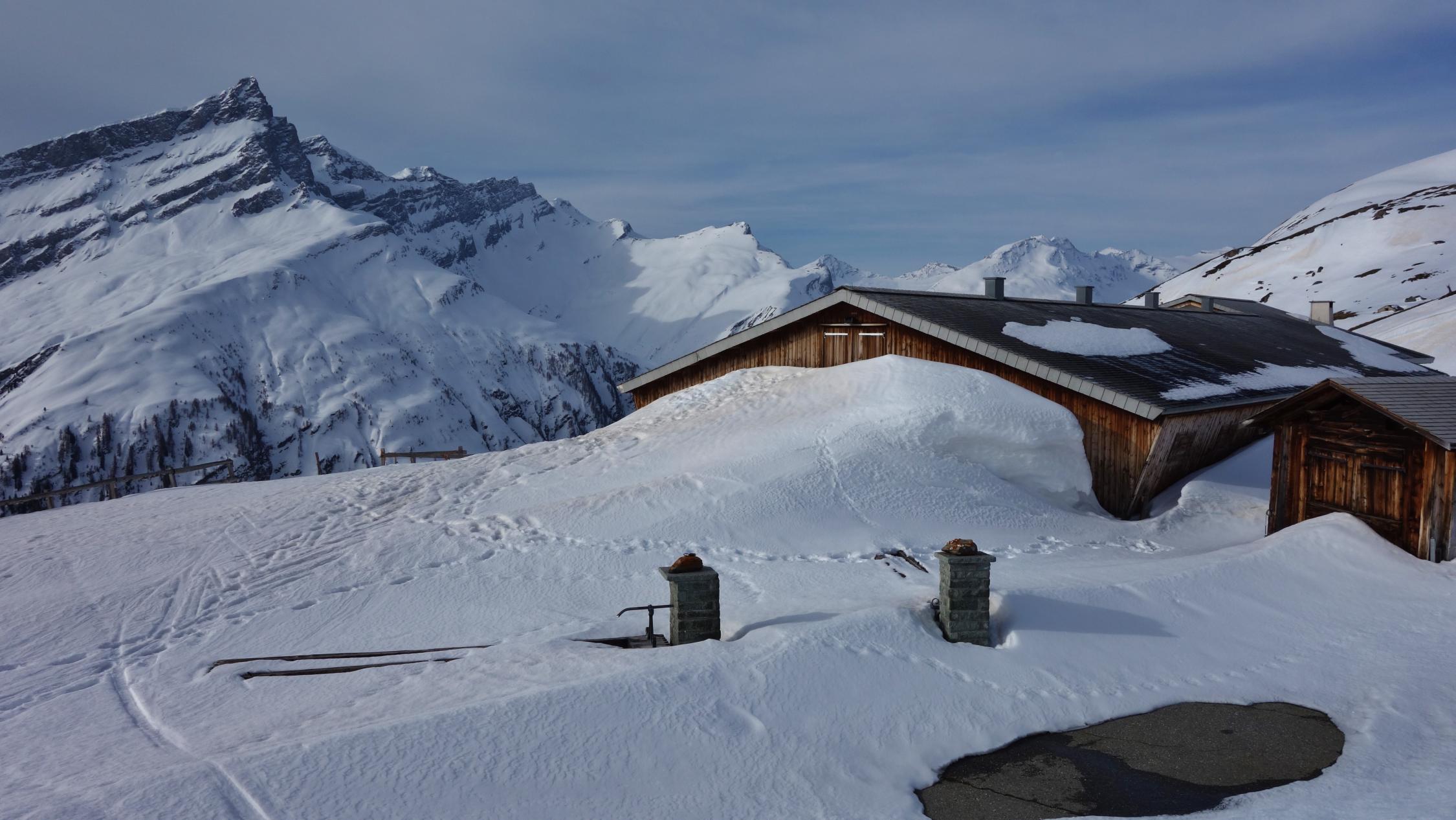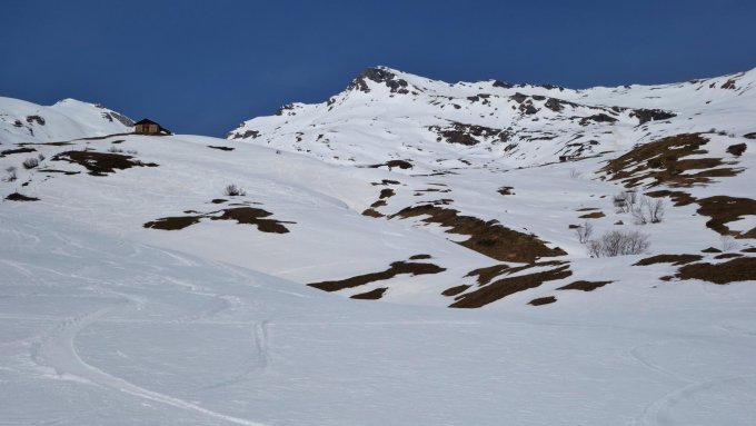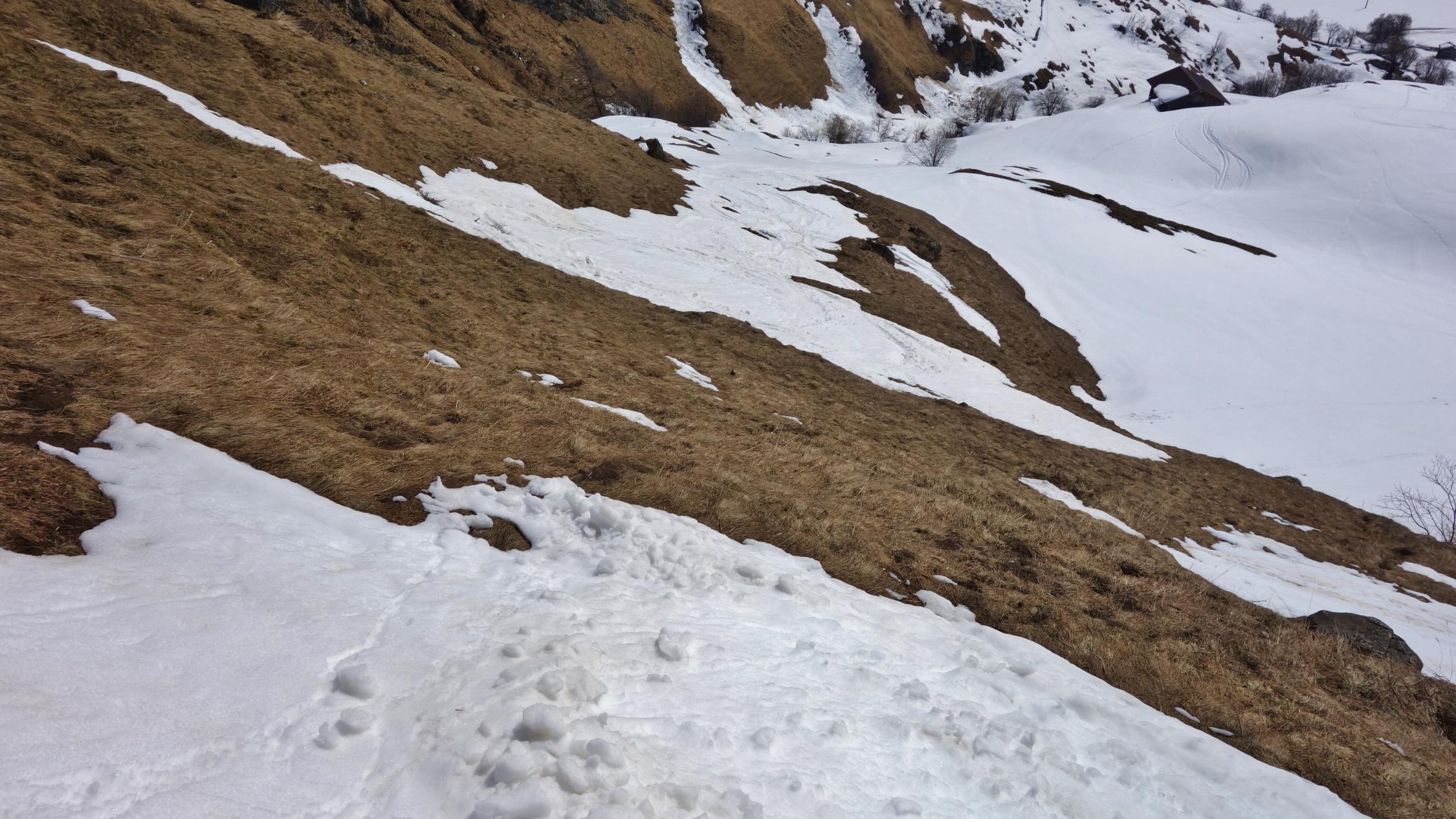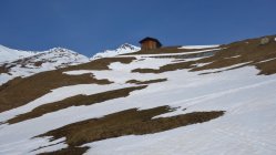 Im unteren Teil wird der Schnee bereits knapp. Wenn man bei der Abfahrt nicht vorausschaut muss schon mal eine kurze Grasski-Passage eingelegt werden. Beim Aufstieg am Anfang am besten dem Alpweg folgen, der hat noch genug Schnee. Diese Woche ist die Tour sicher noch gut machbar.