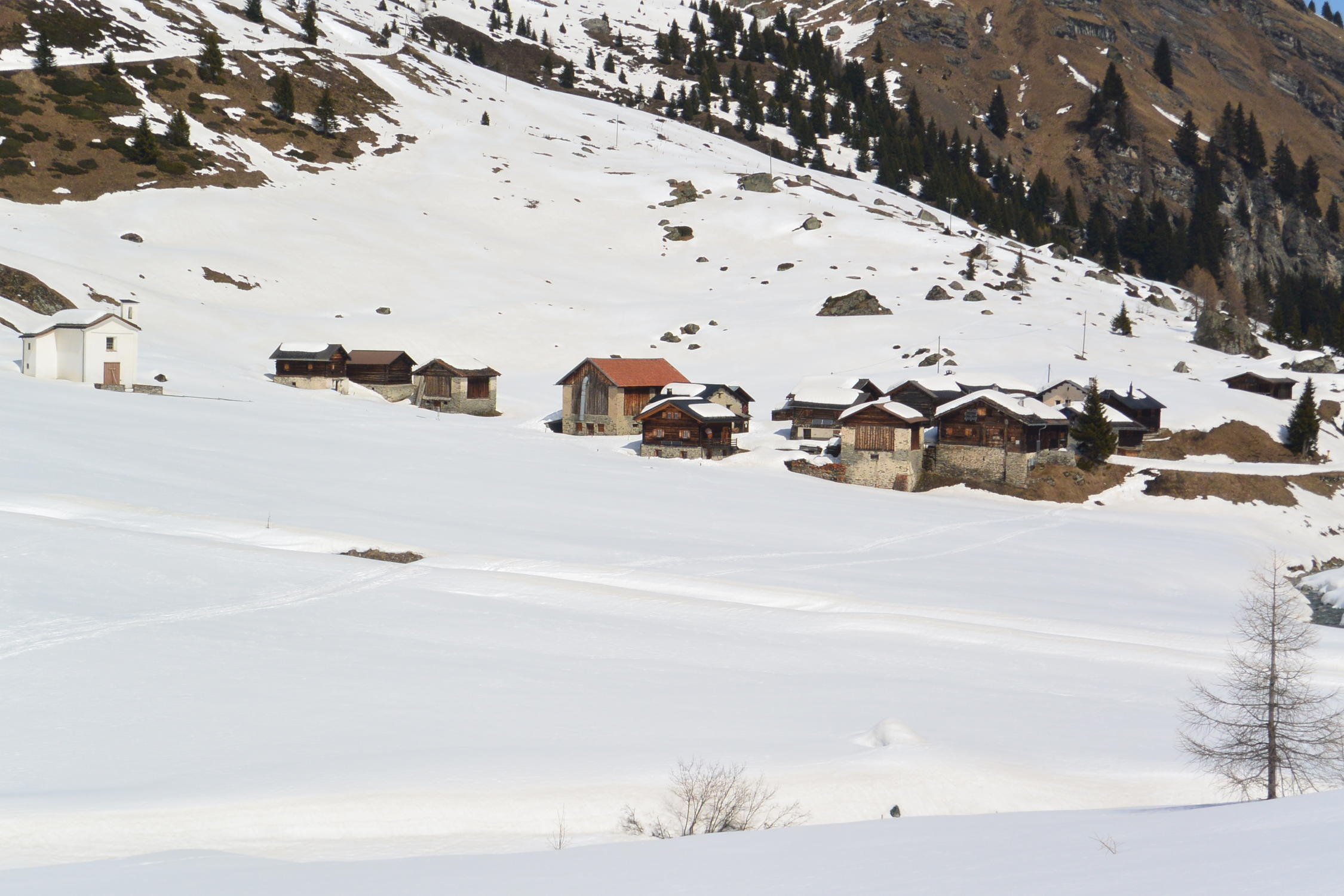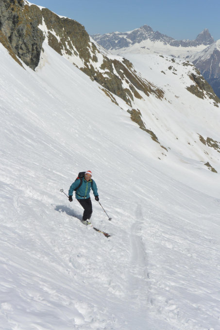 Abfahrt: Vom Gipfel bis ins Val Bercla Pulver- Bruchharst- und auch Sulzschnee. Ab Val Bercla bis Mulegns Sulzschnee