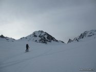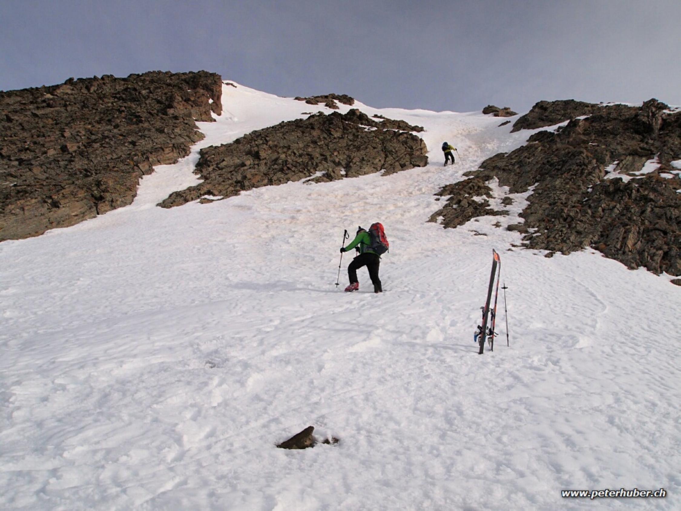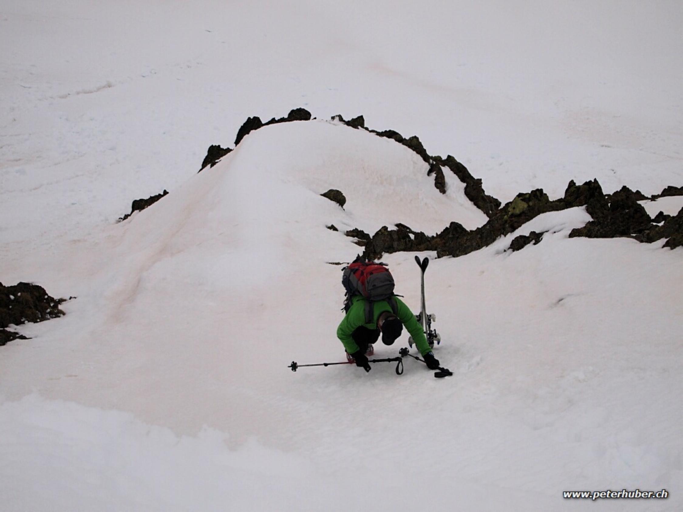 Im Aufstieg auf dem Vadret Viluoch sehr griesiger Schnee und mühsam zum Spuren. Die Südseite des Grates östlich des Piz Viroula sind wir ca. 50 m steil zu Fuss abgestiegen.