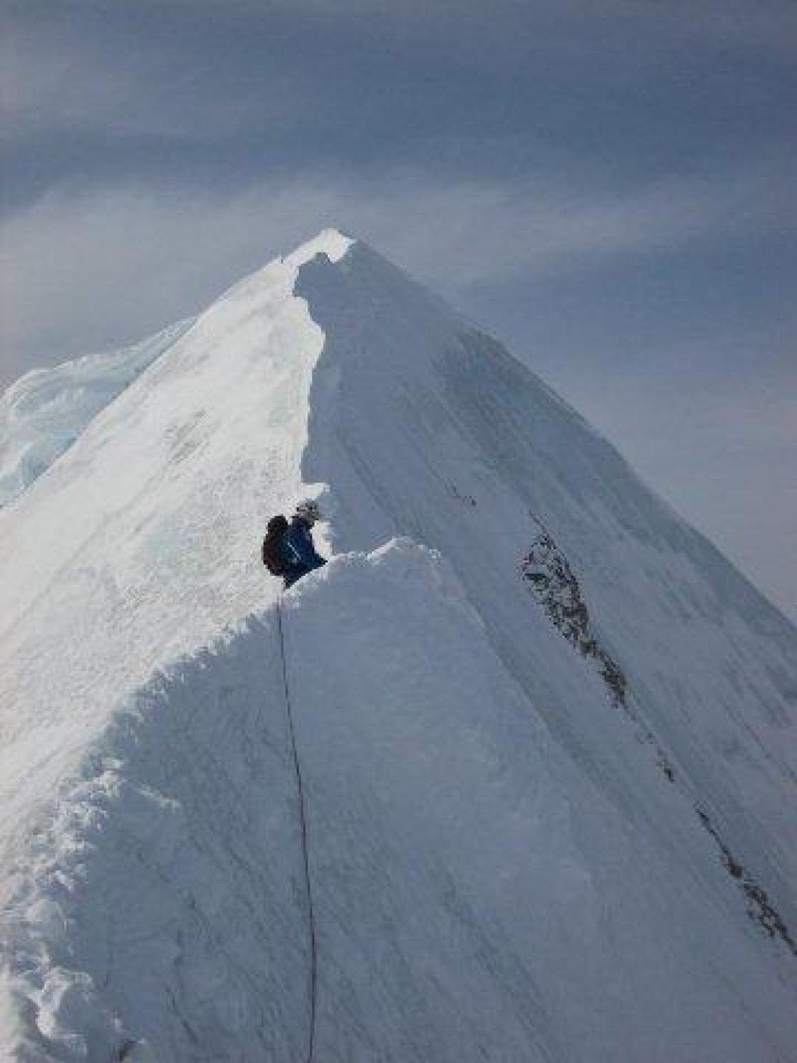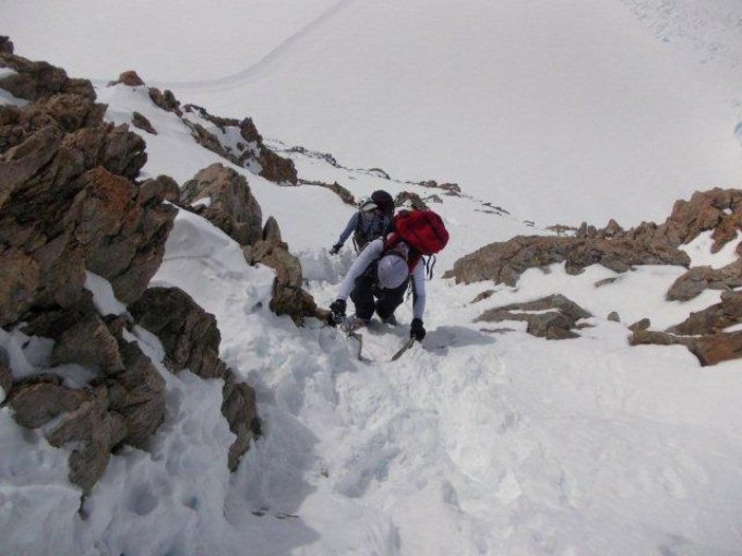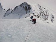 Snow and mixed conditions in the lower part of the ridge. Blank ice on the last part of the S arm and up all the way to the summit. We climbed one rope length of the E ridge then turned back due to the slow progress (only one ice axe per person).