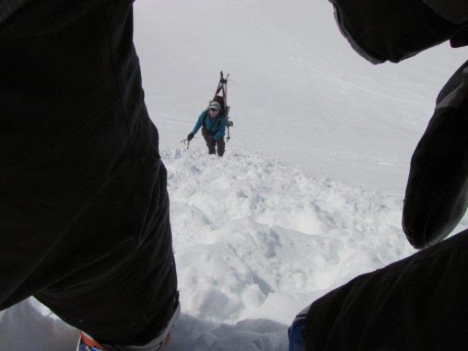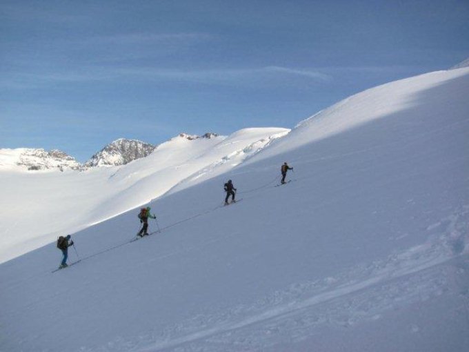 Good snow cover to Fieschersattel, bergschrund without problem, steps to the sadle. Ice above saddle, we climbed below the ridge (on the E) until first notch than ascend it via ice/mix gully (II, abseil in descent). Ridge mostly dry, some parts snow.