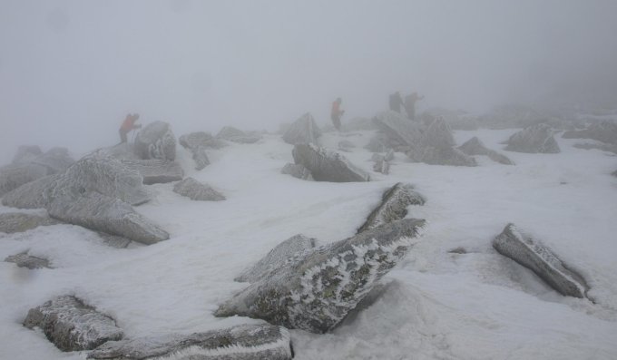 Skidepot kurz unterhalb des Gipfels. Blockfeld nur zu Fuss sinnvoll.