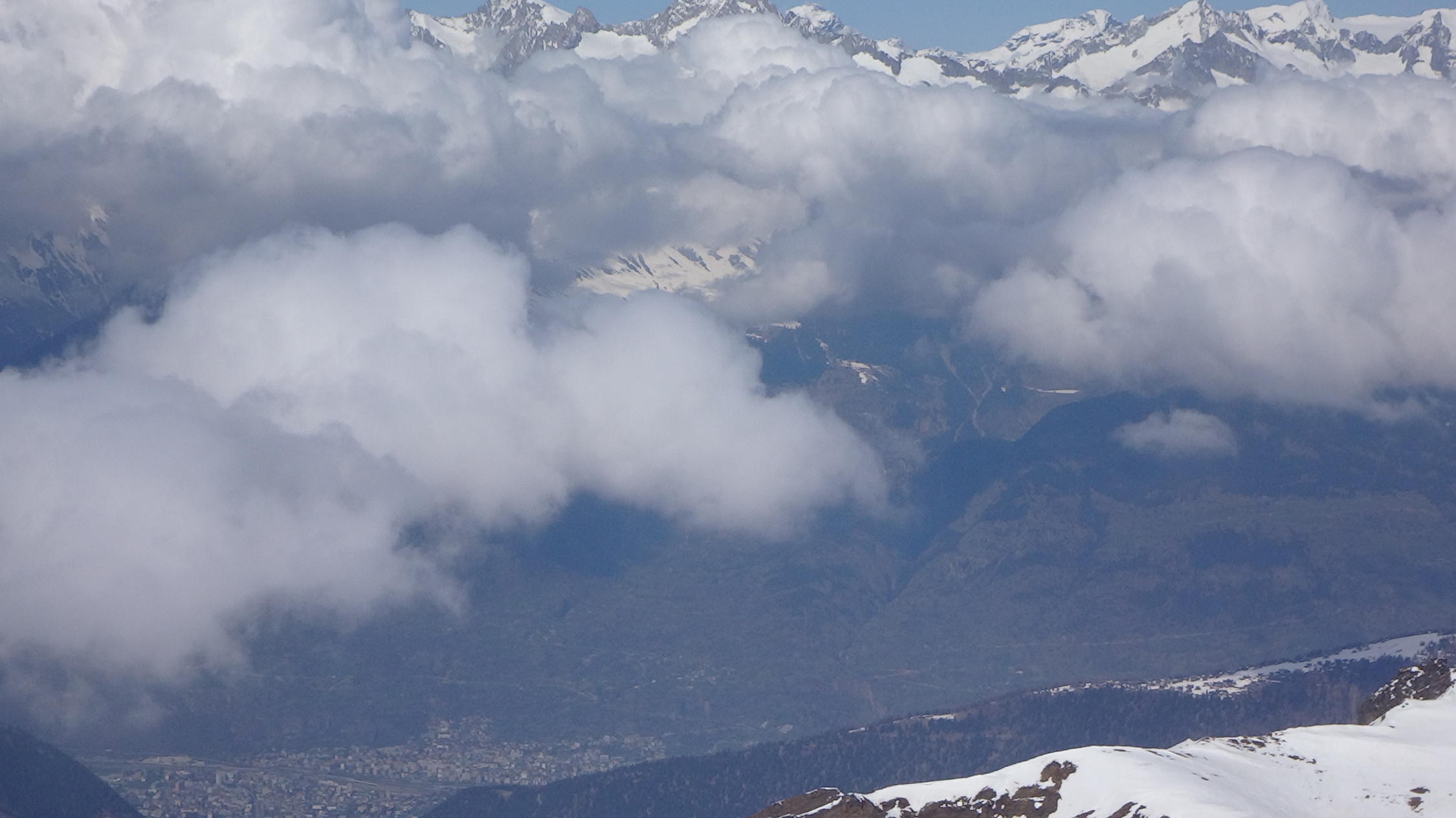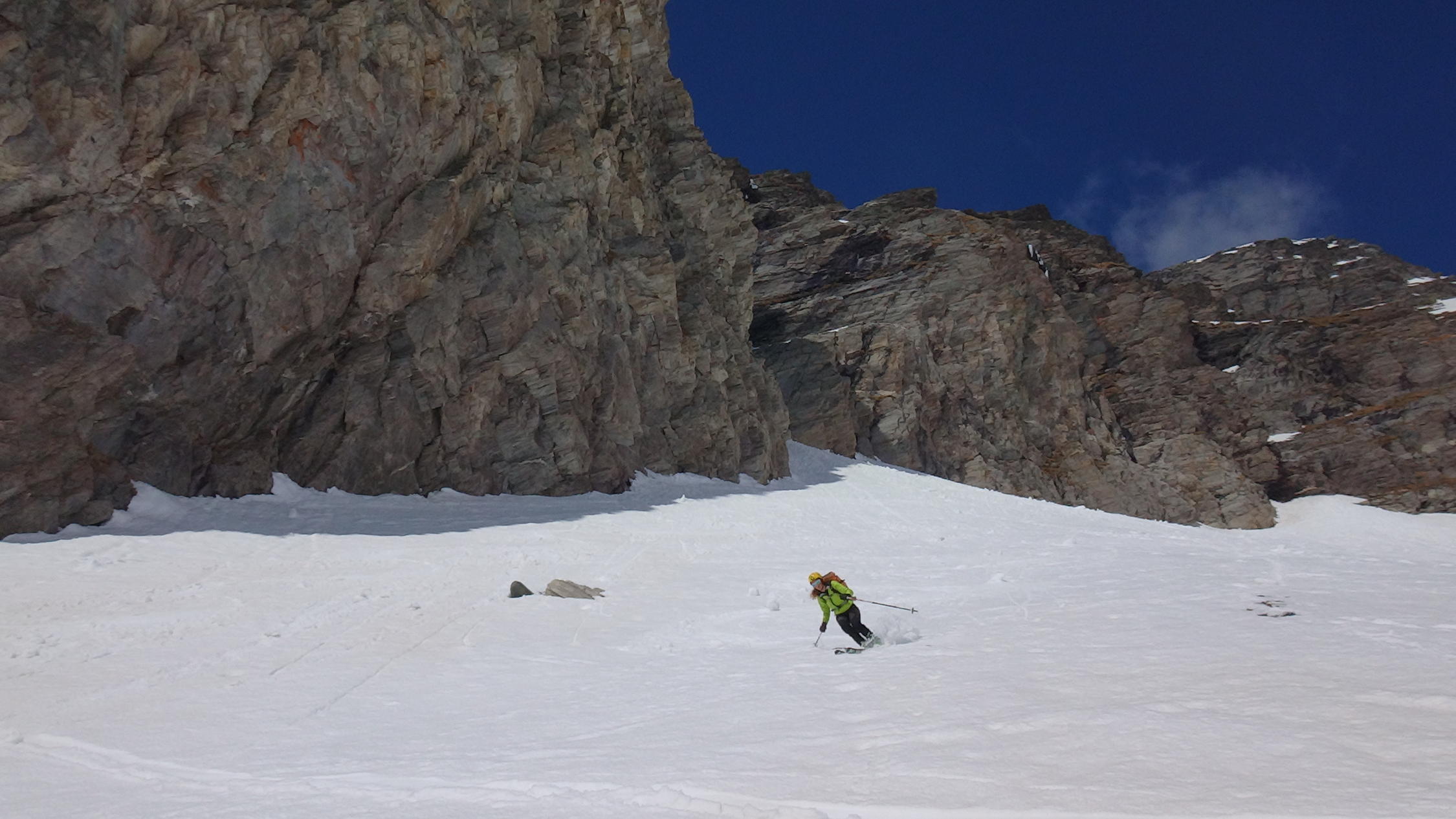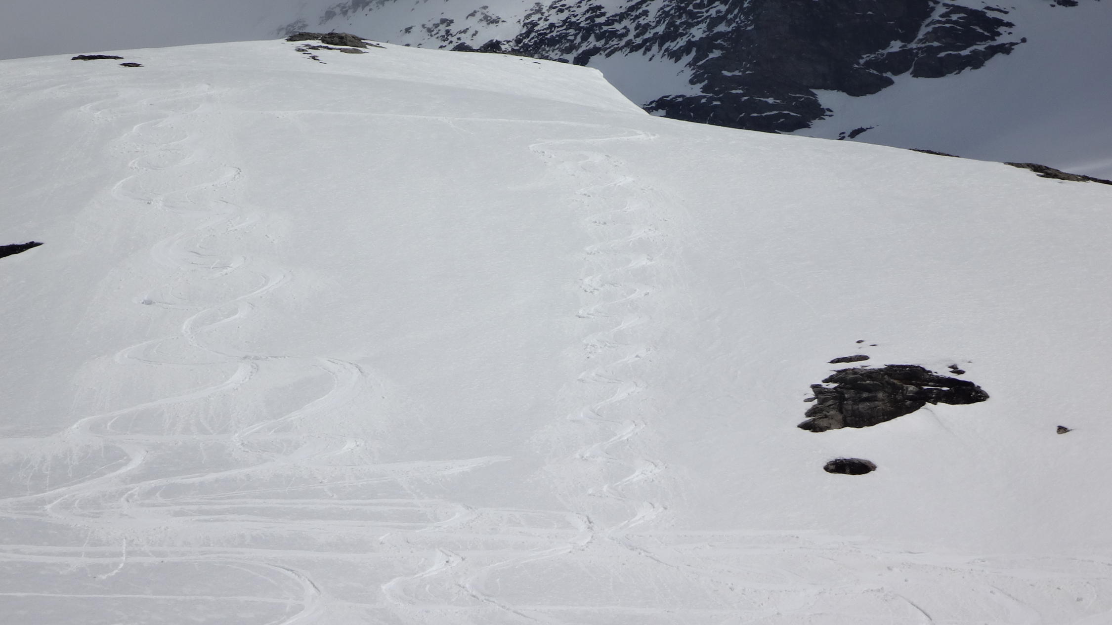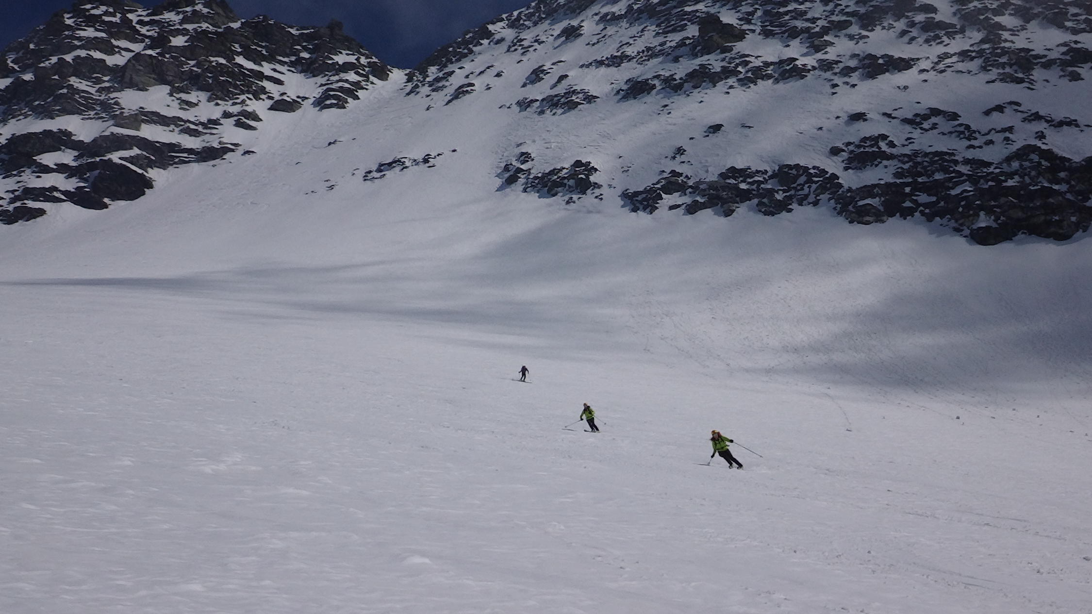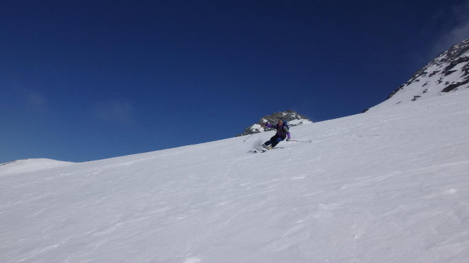 Von gipfel bis 2850m ,links hang gut hart-pulver schnee, dann SW hang gut sulzschnee, in der wald lezte schnne,