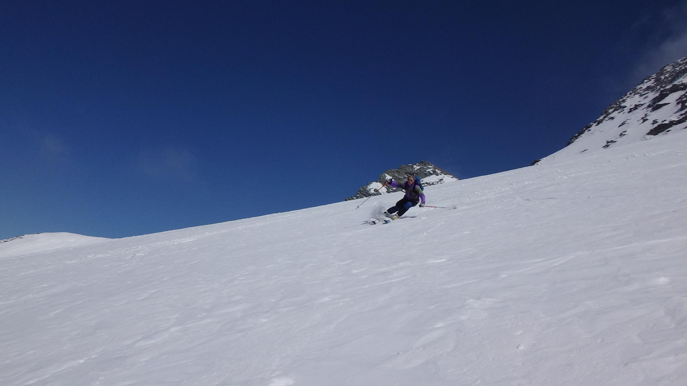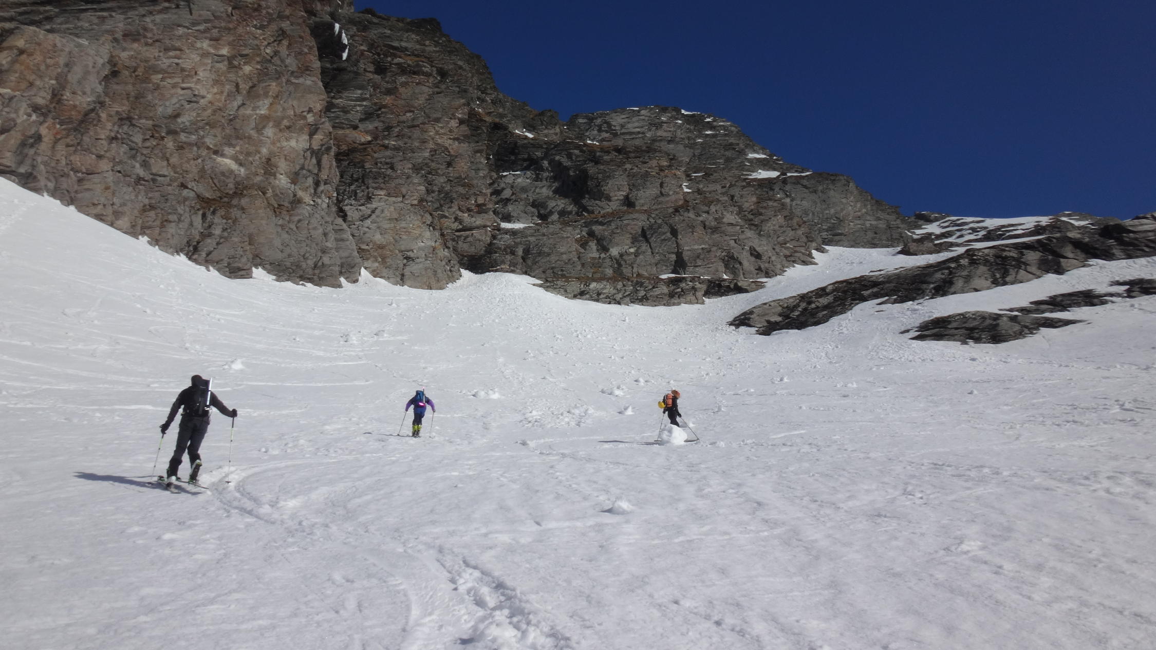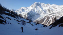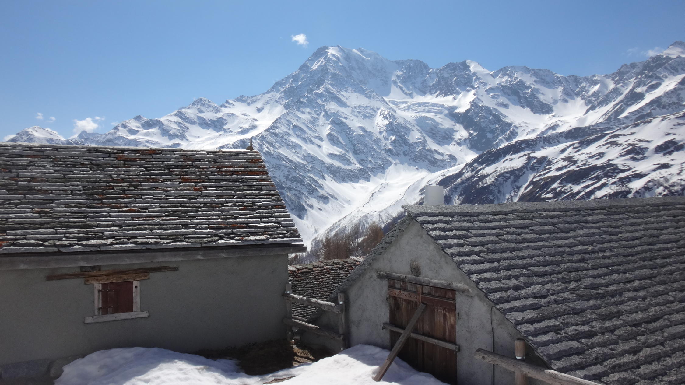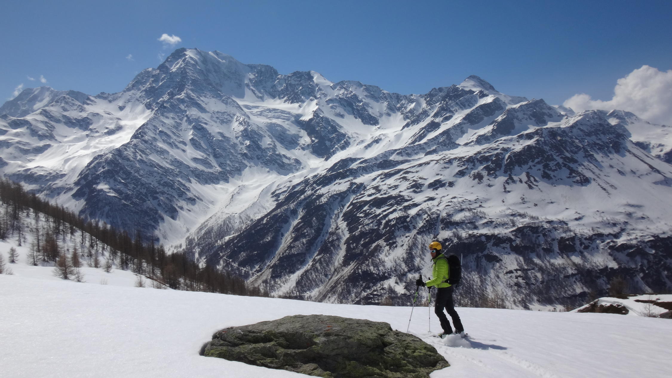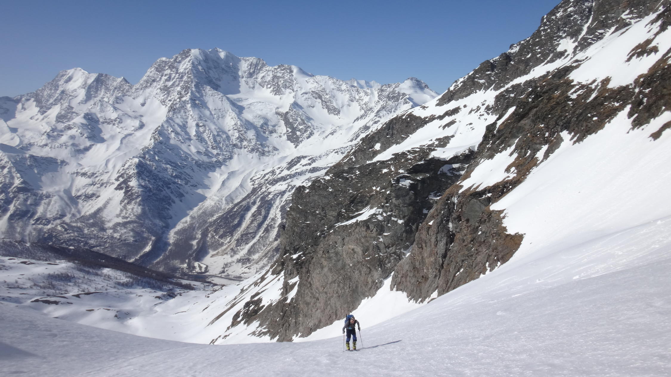gute skitour fur ende saison , ohne leute, mit wunderbaren Blick auf die Fletschhonrn. Schone abstieg bis etwa 40°, 1800m ski ohne Druck.