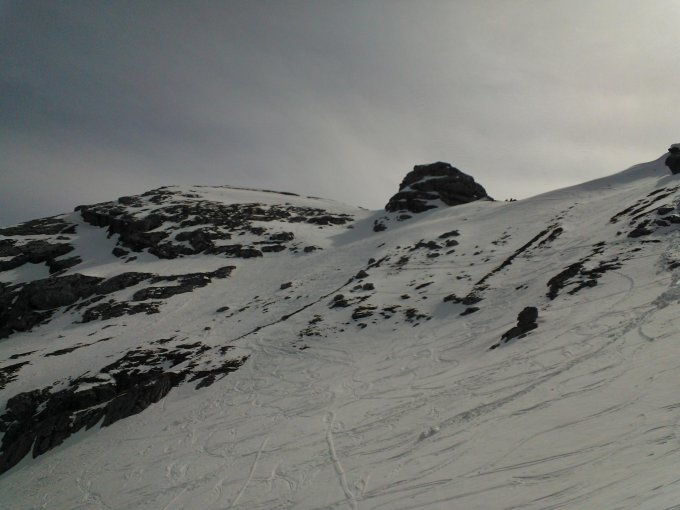 Zwei Bretter liegen im ersten Steilhang zur Spillgerte. Sieht nicht mehr sehr einladend aus, viele Böllen drin.