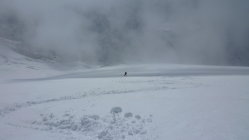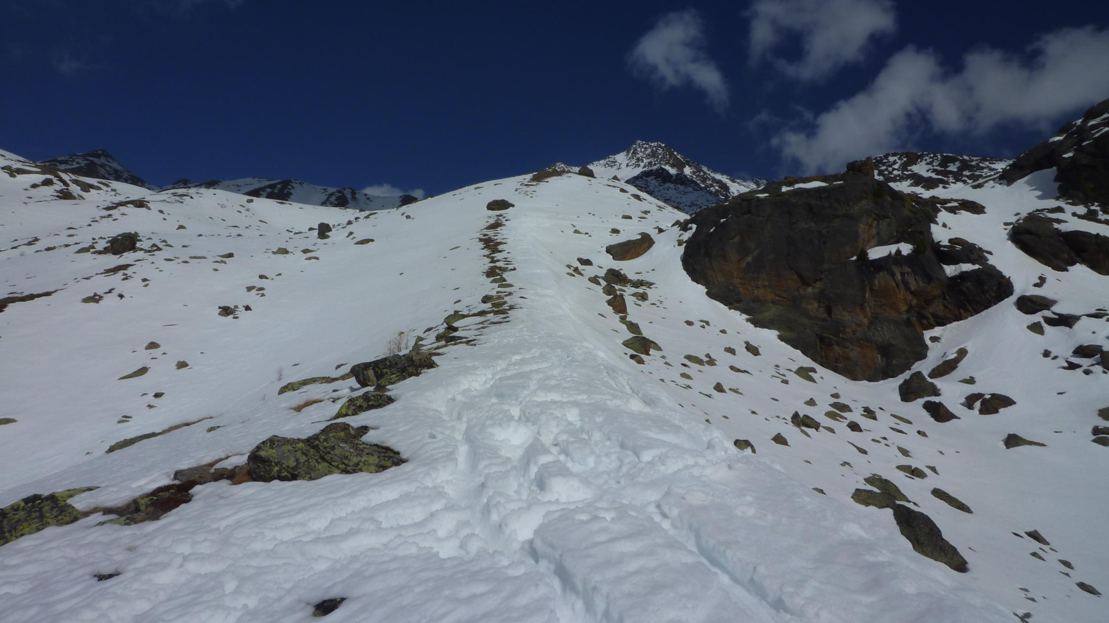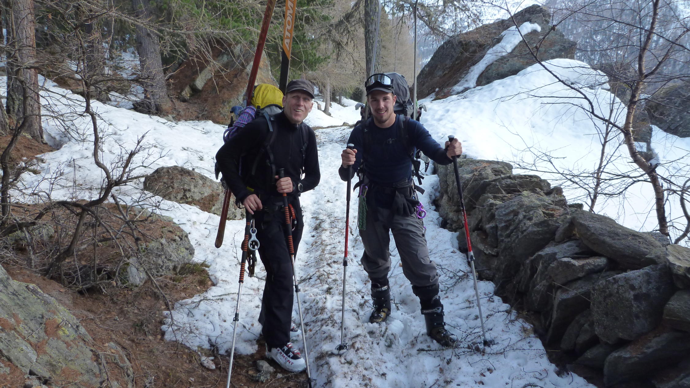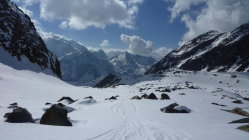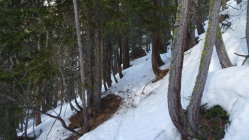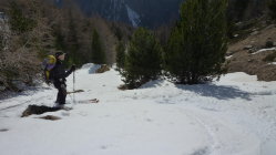 Im Aufstieg harten griffiger Schnee, mit ordentlicher Spur, Harscheisen unabdinglich. In der Abfahrt gab es alles. Von schönem Sulz über leichten Firn, Bruchharsch und absolutem Sumpfschnee bis zu keinem Schnee. Was will man erwarten wenn es 2500 hm nach unten geht.Zum Schluss über den Forstweg noch ganz passabel nach unten gekommen. Da wird es wohl jeden Tag jetzt weniger. Alles in allem ging es noch sehr gut.