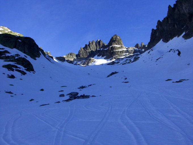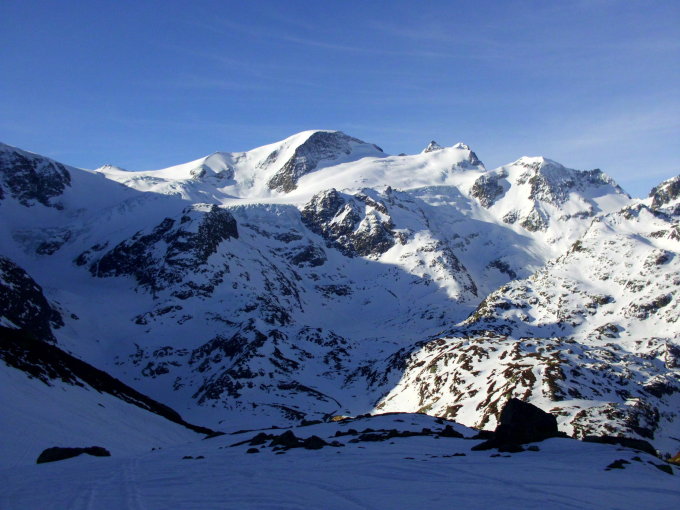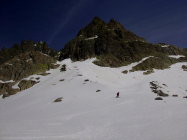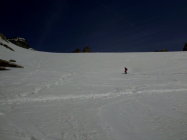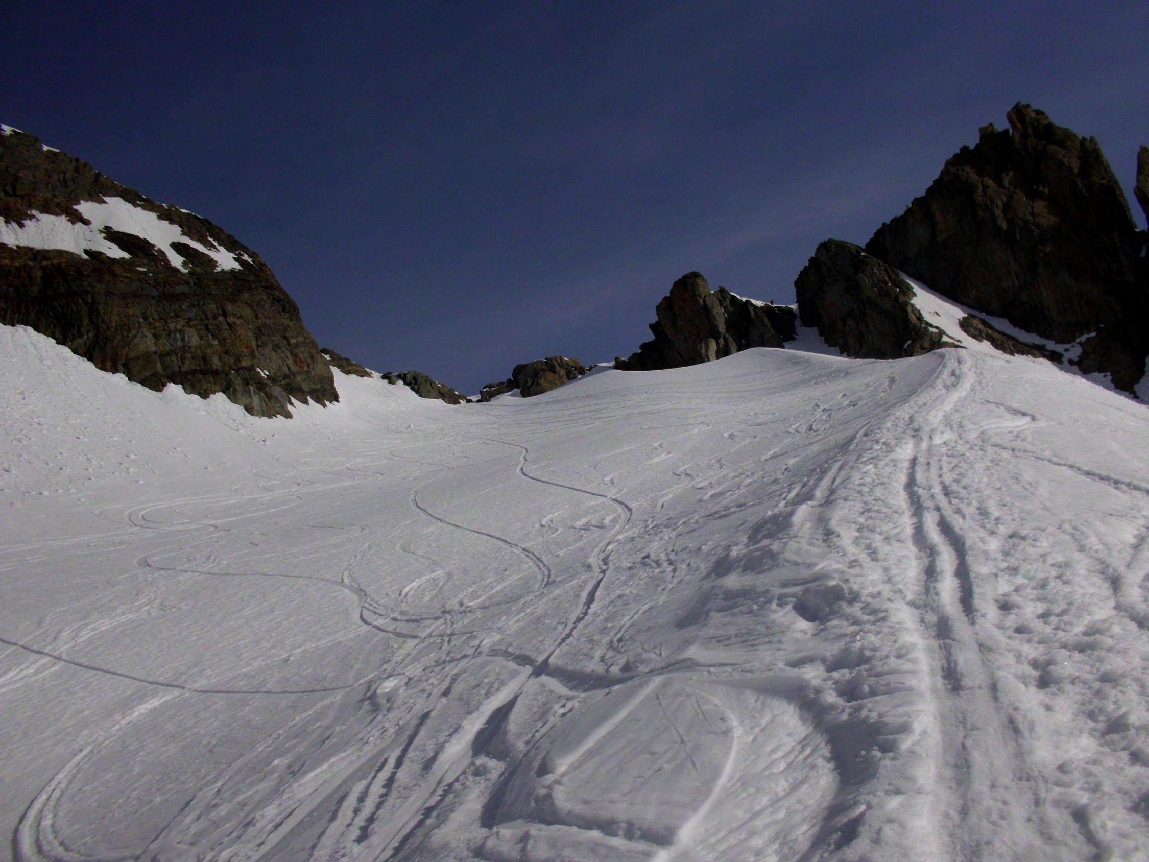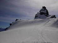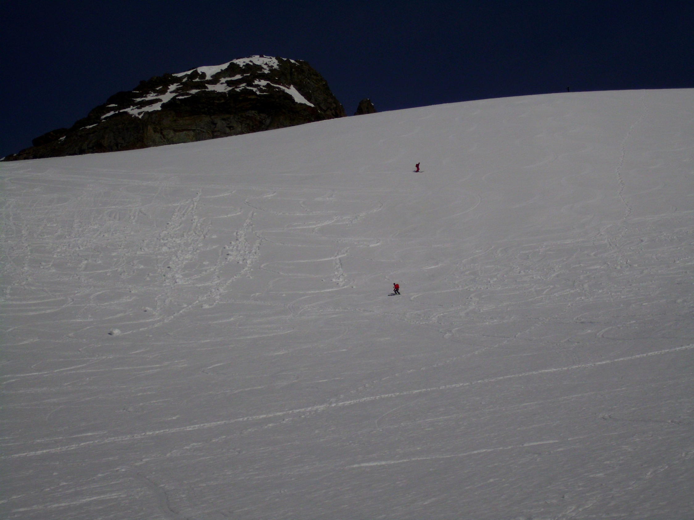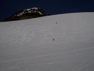 Im Aufstieg harte, gefrorene Spur, ab rund 2800m schon recht sulzig (11uhr).