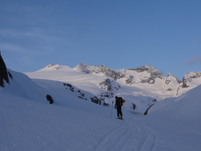 Aufstieg von der Capanna erst über die Strasse und dann in erwähnten unangenehmen Steilhang. Ab dem Tälchen oben angenehmes, wenn auch etwas hügeliges Gelände. Strecke über den Gletscher erscheint endlos, da wenig steil. Der Gipfel will nicht näher kommen.