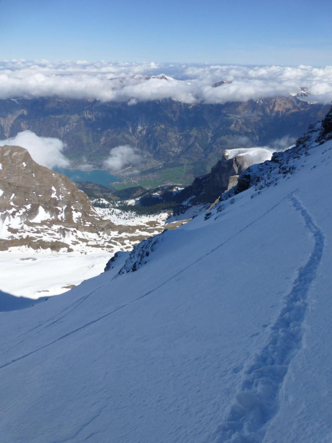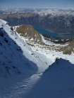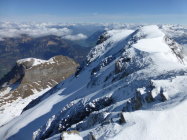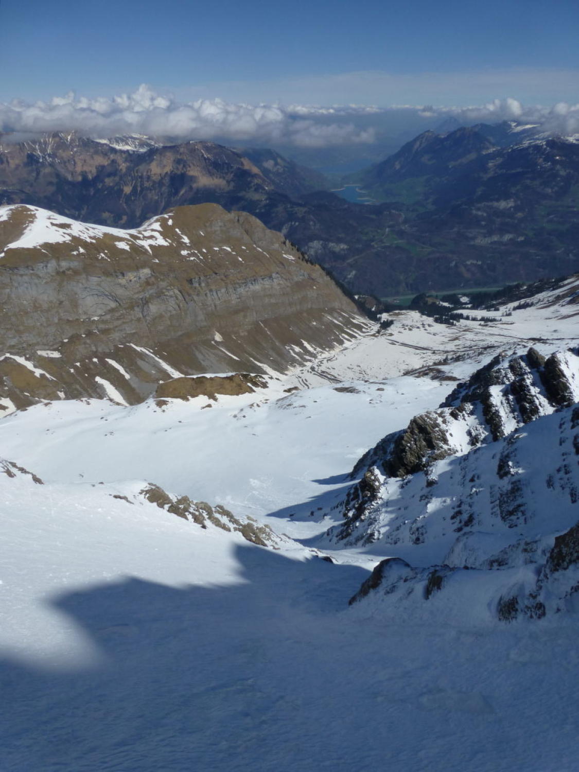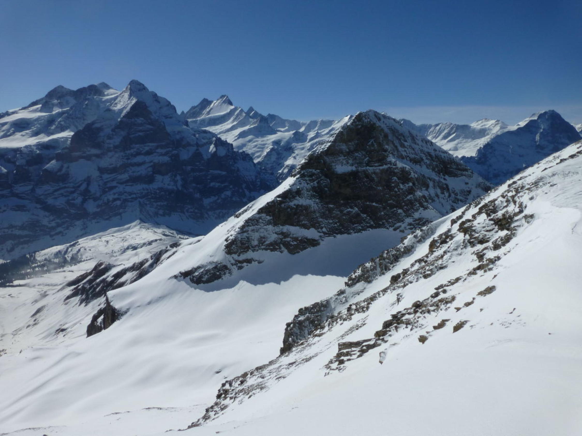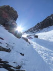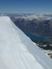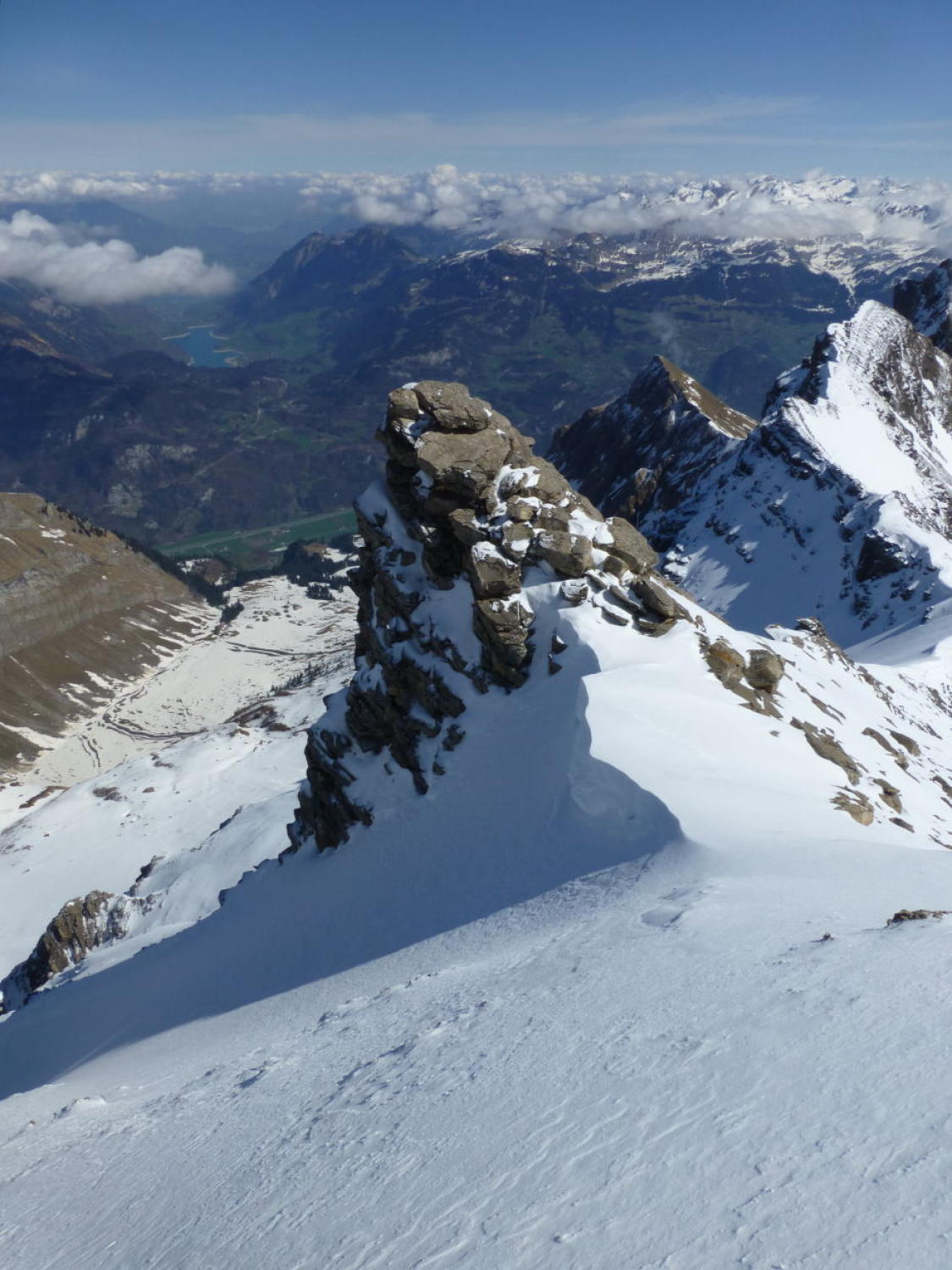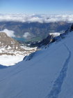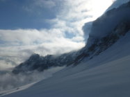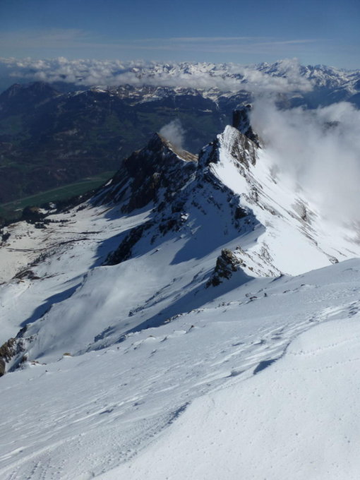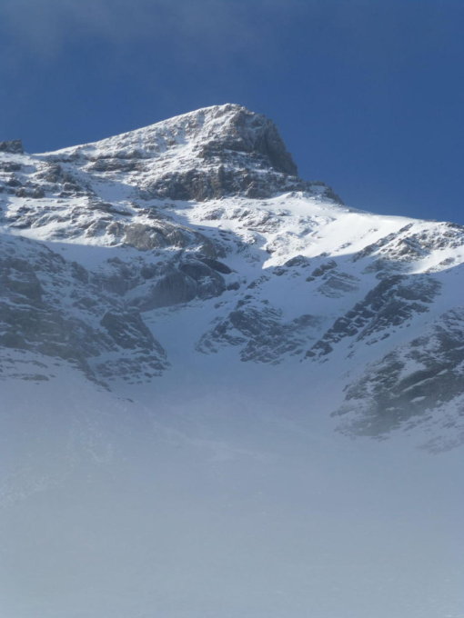 Morgens noch Restbewölkung, die sich rasch auflöst, dann sonnig. Ski unterhalb 1350m getragen, Schneedecke dann bis unter den NE-Grat vom Regen durchnässt, aber tragend gefroren. Ab ca. 2300m 5-15cm Presspulver. Tragpassage unter dem NE-Grat Trittschnee, N-Couloir abwechselnd Presspulver und angefroren griffig, 2-3 Steinkontakte. Am Mittag ab Musegg aufgeweicht.