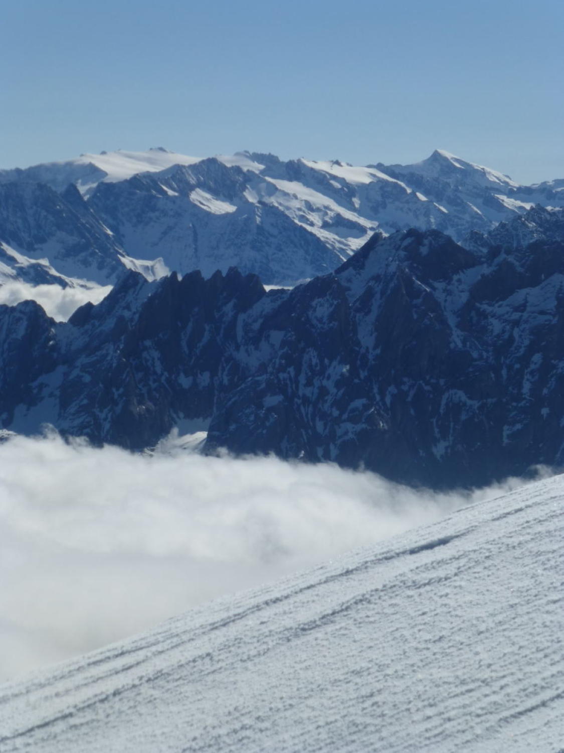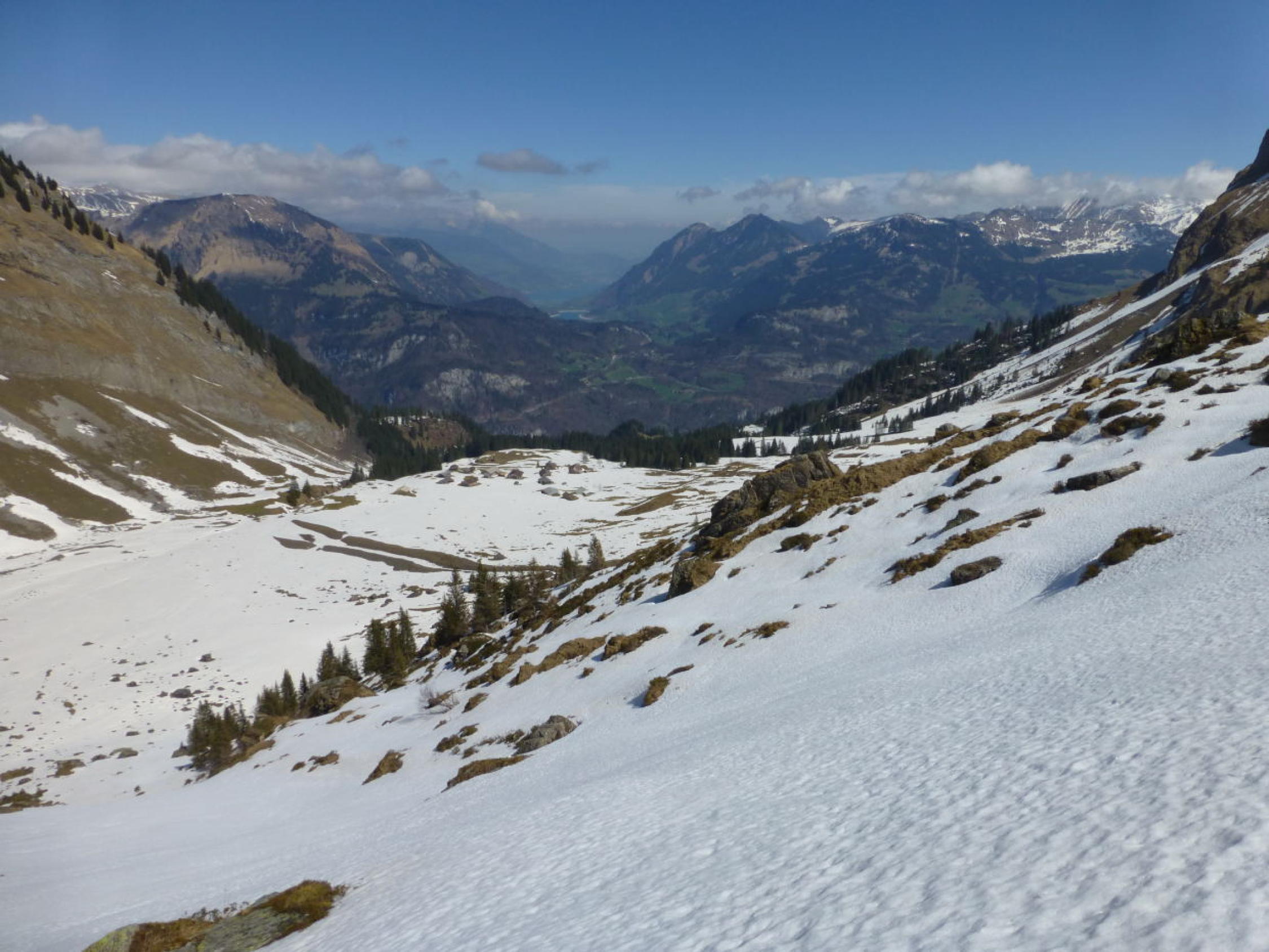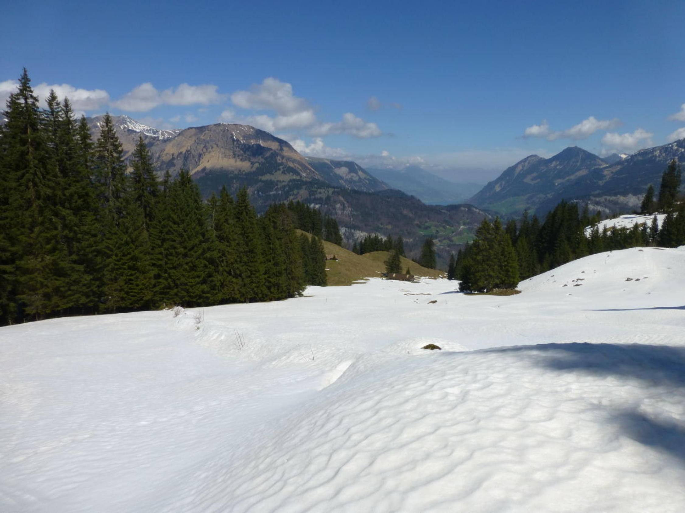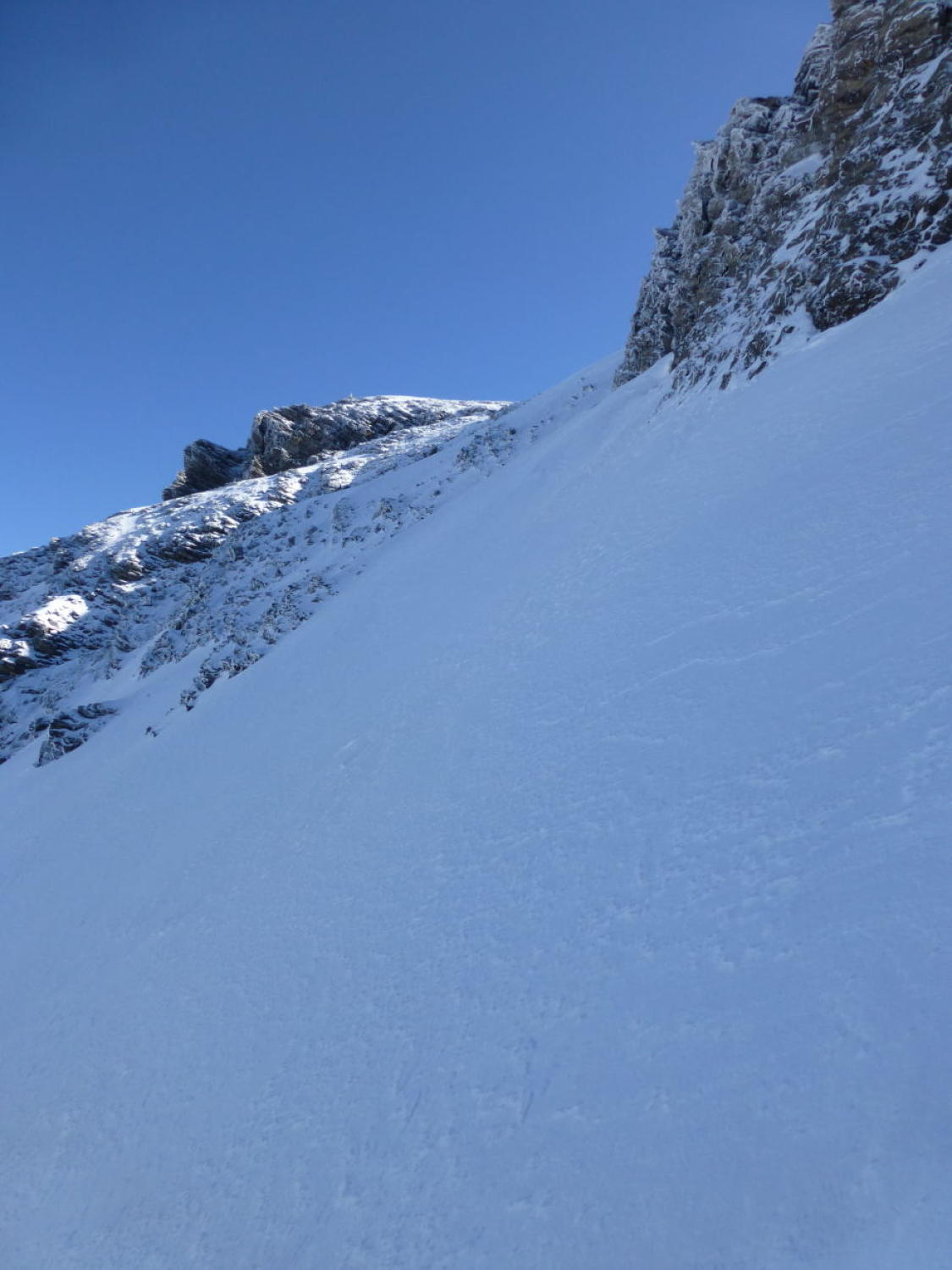 Morgens noch Restbewölkung, die sich rasch auflöst, dann sonnig. Ski unterhalb 1350m getragen, Schneedecke dann bis unter den NE-Grat vom Regen durchnässt, aber tragend gefroren. Ab ca. 2300m 5-15cm Presspulver. Tragpassage unter dem NE-Grat Trittschnee, N-Couloir abwechselnd Presspulver und angefroren griffig, 2-3 Steinkontakte. Am Mittag ab Musegg aufgeweicht.