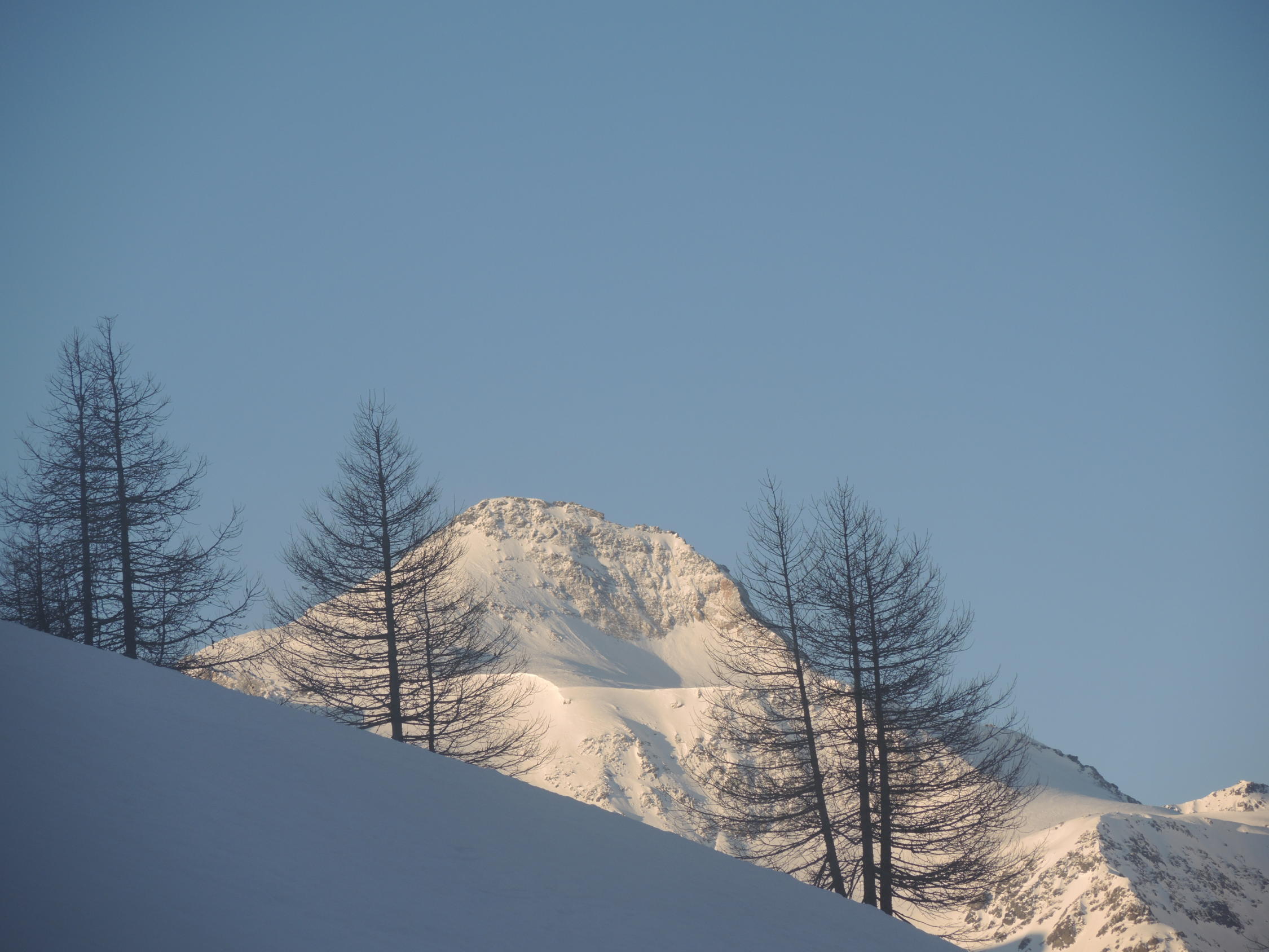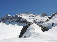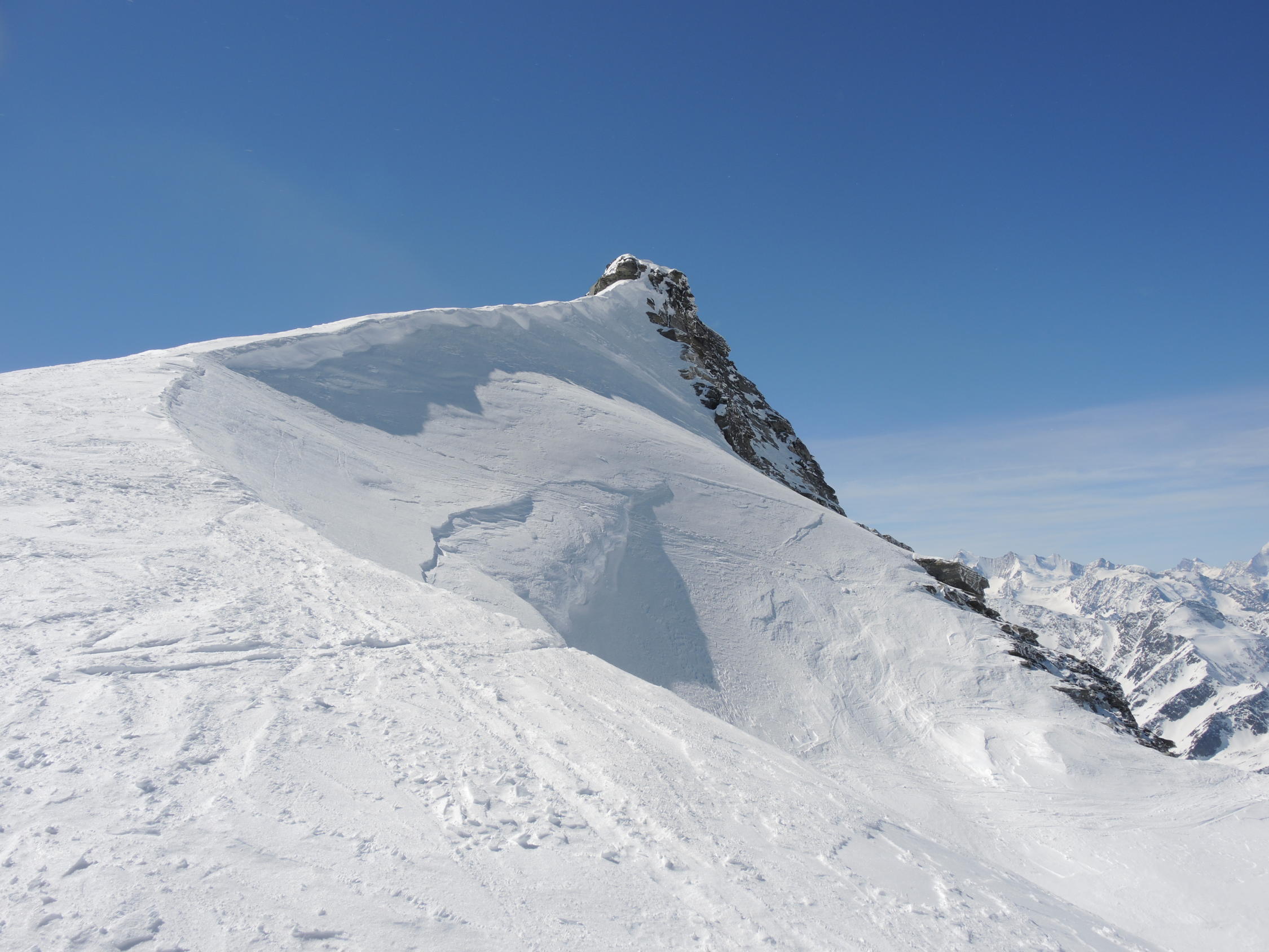 hart, kaum aufgesulzt, starker Wind, Presspulver vom Sattel und Hartschnee im unteren Teil