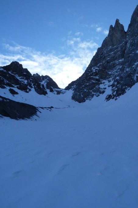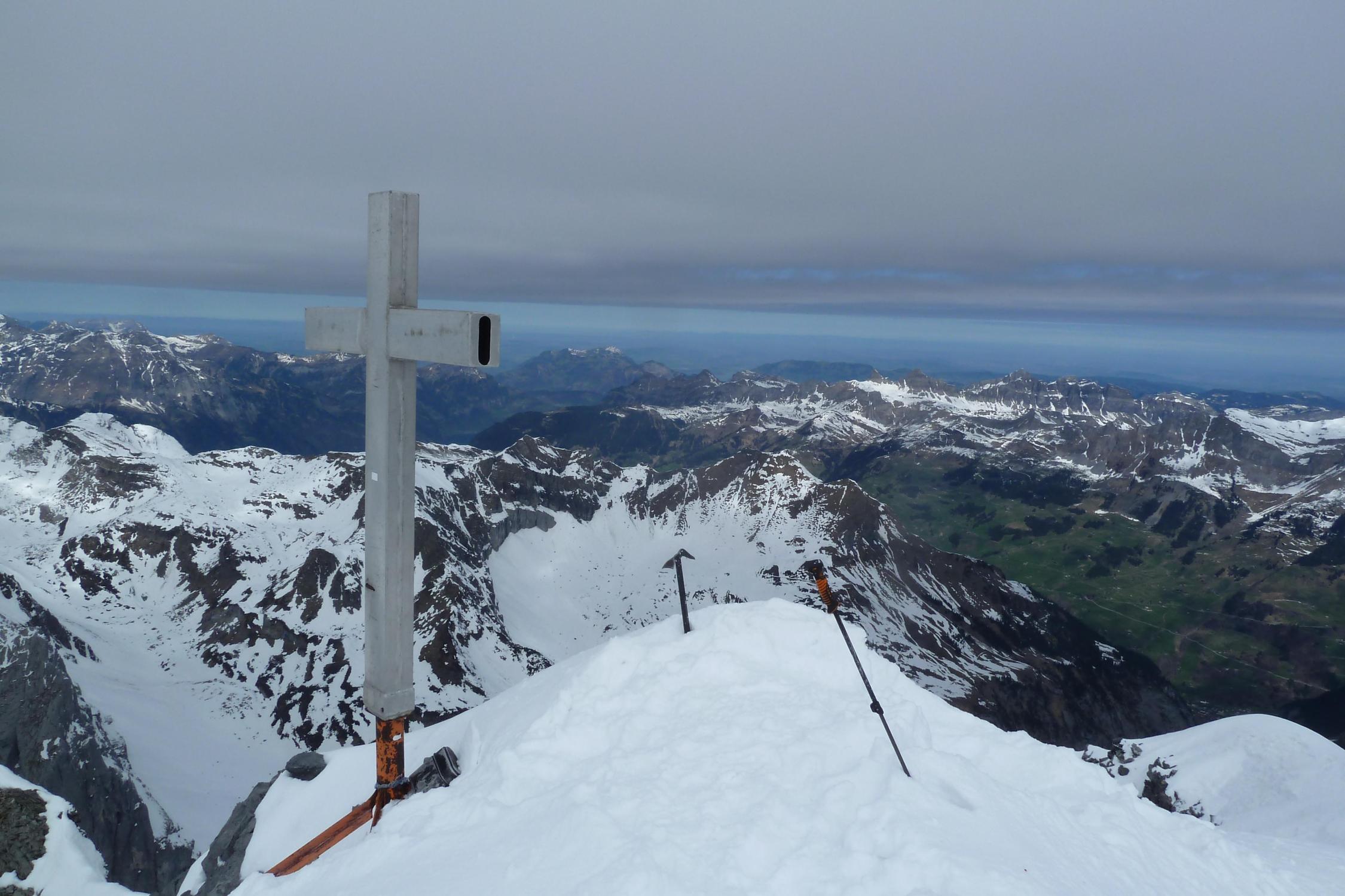 Bis zum Ruchchälenpass hart gefrorener Firn, dann bis zum Gipfel 5 cm Neuschnee.