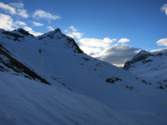 Sehr gut tragende Schneedecke vom Start bis zum Gipfel. Im Abstieg bis ca. 2‘600 Mt. noch gut, dann aufsulzend. Streckenweise lag verfrachterer Schnee auf der harten Unterlage, was im Abstieg zu Gute kam…