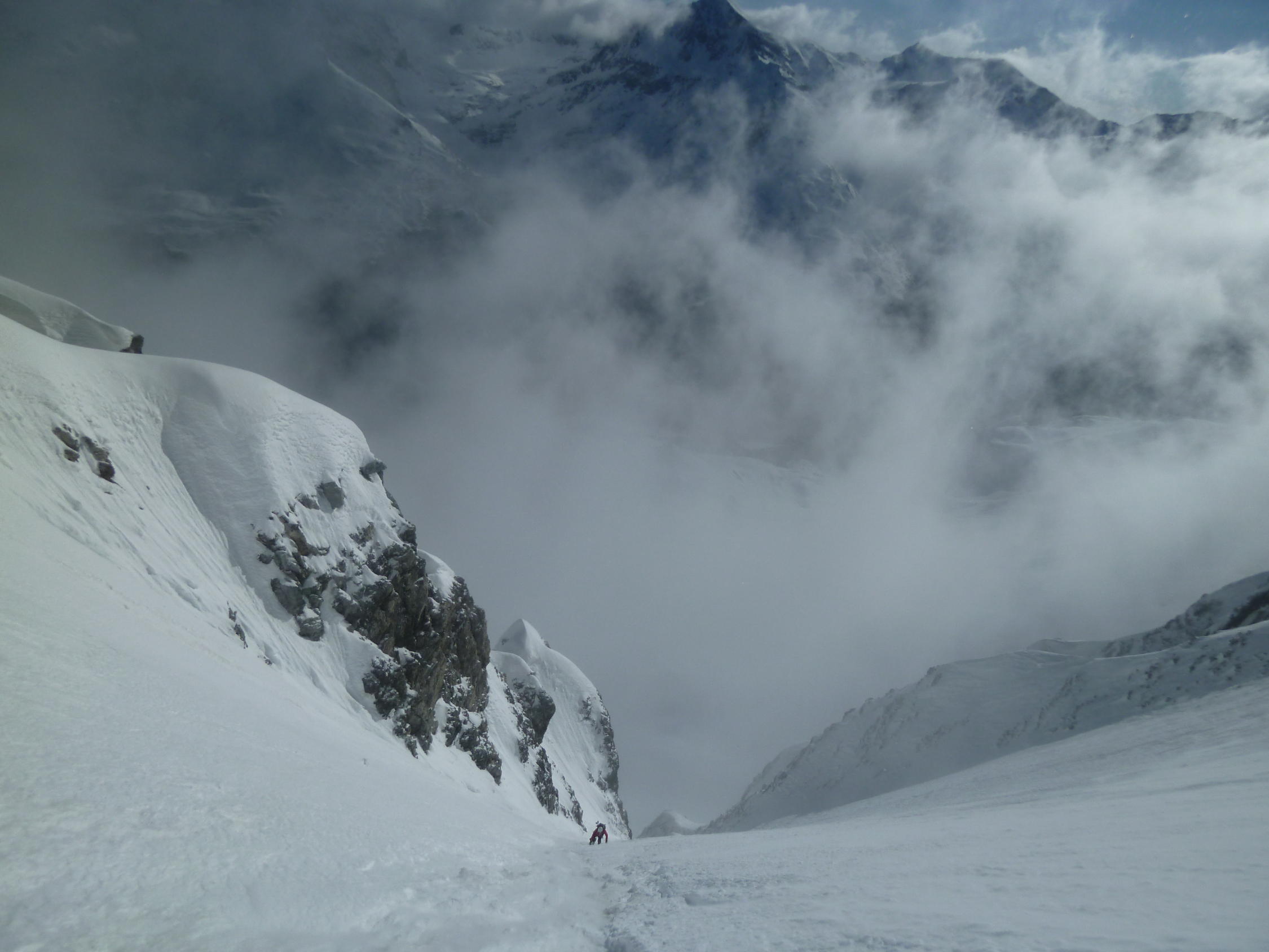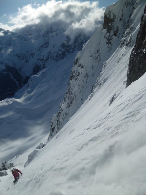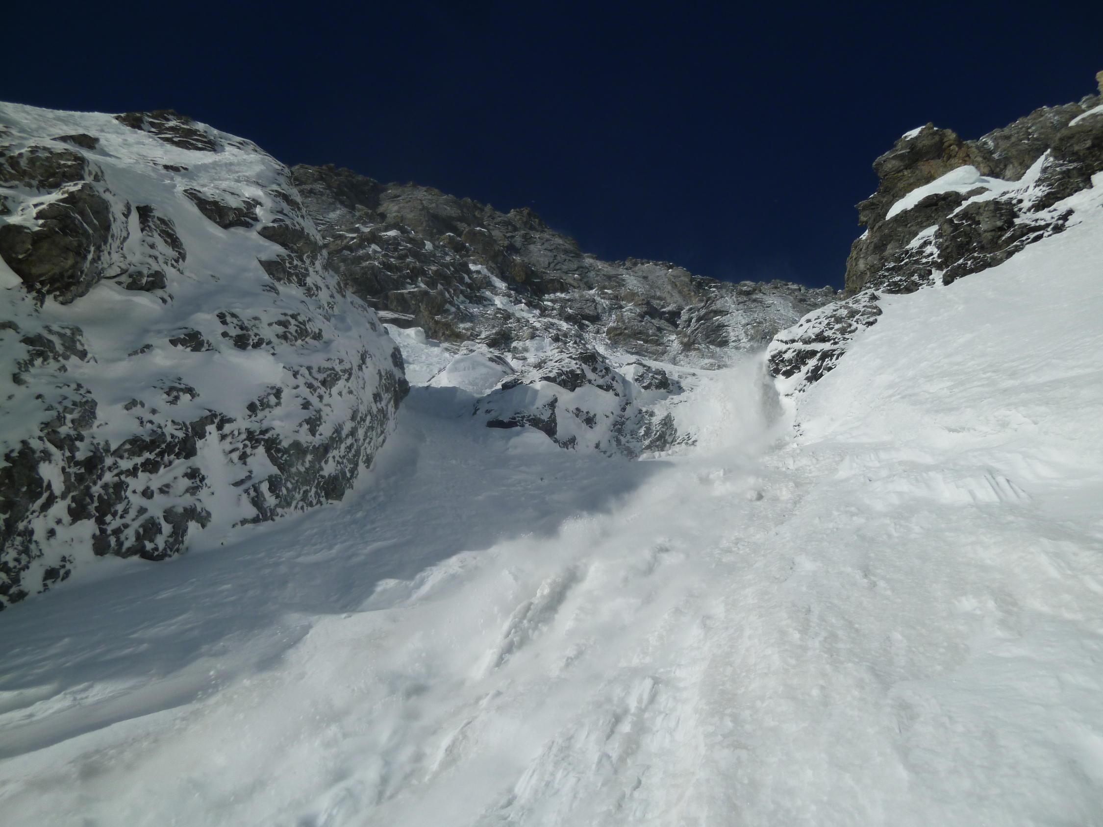 Aufgrund des starken Nordföhns ging durch den schmalen Lawinengraben immer wieder einiges an Spindrift ab, der jedoch nicht störte wenn man außerhalb diedser Bahn blieb. ansonsten keine Lawinen