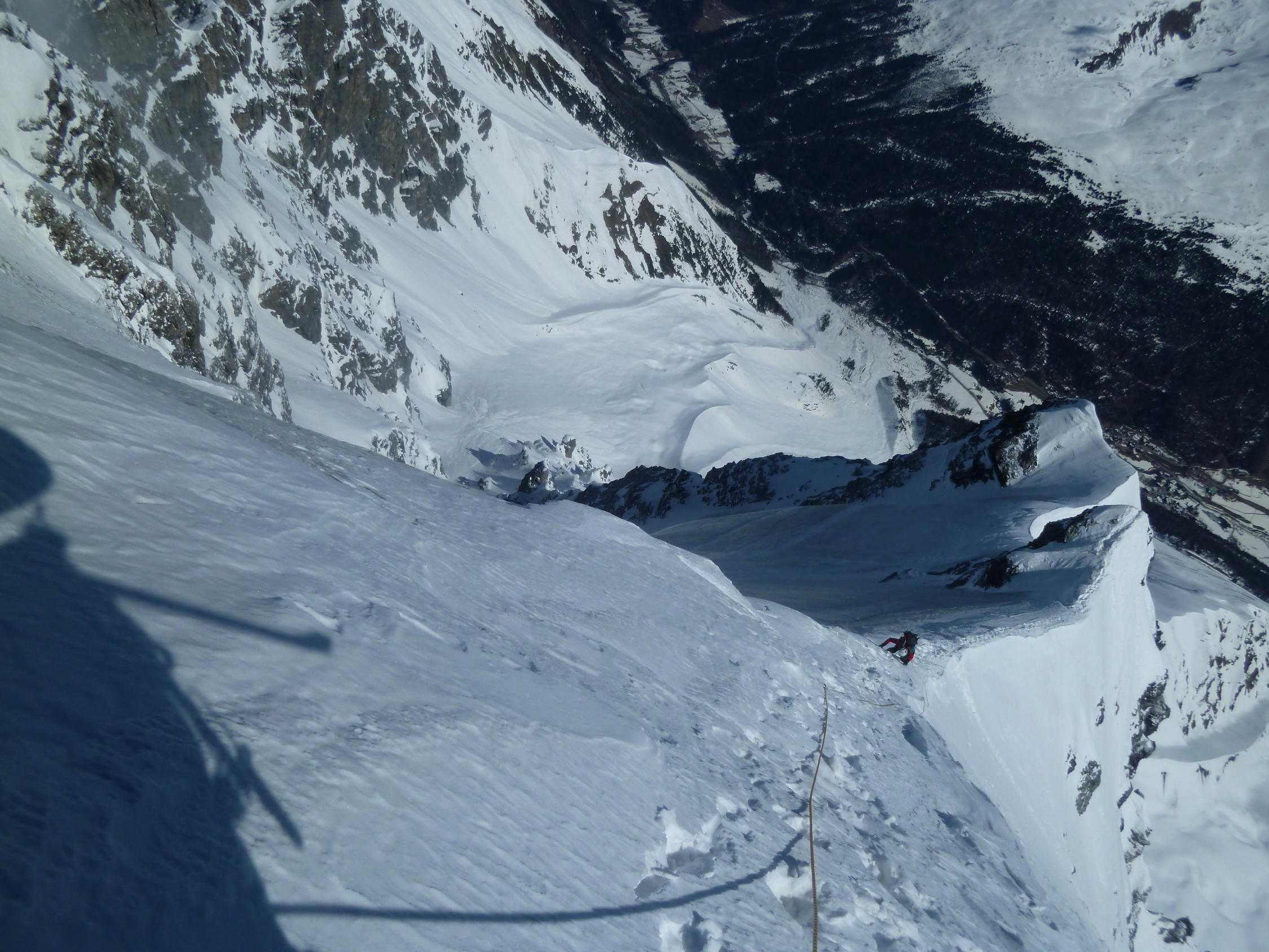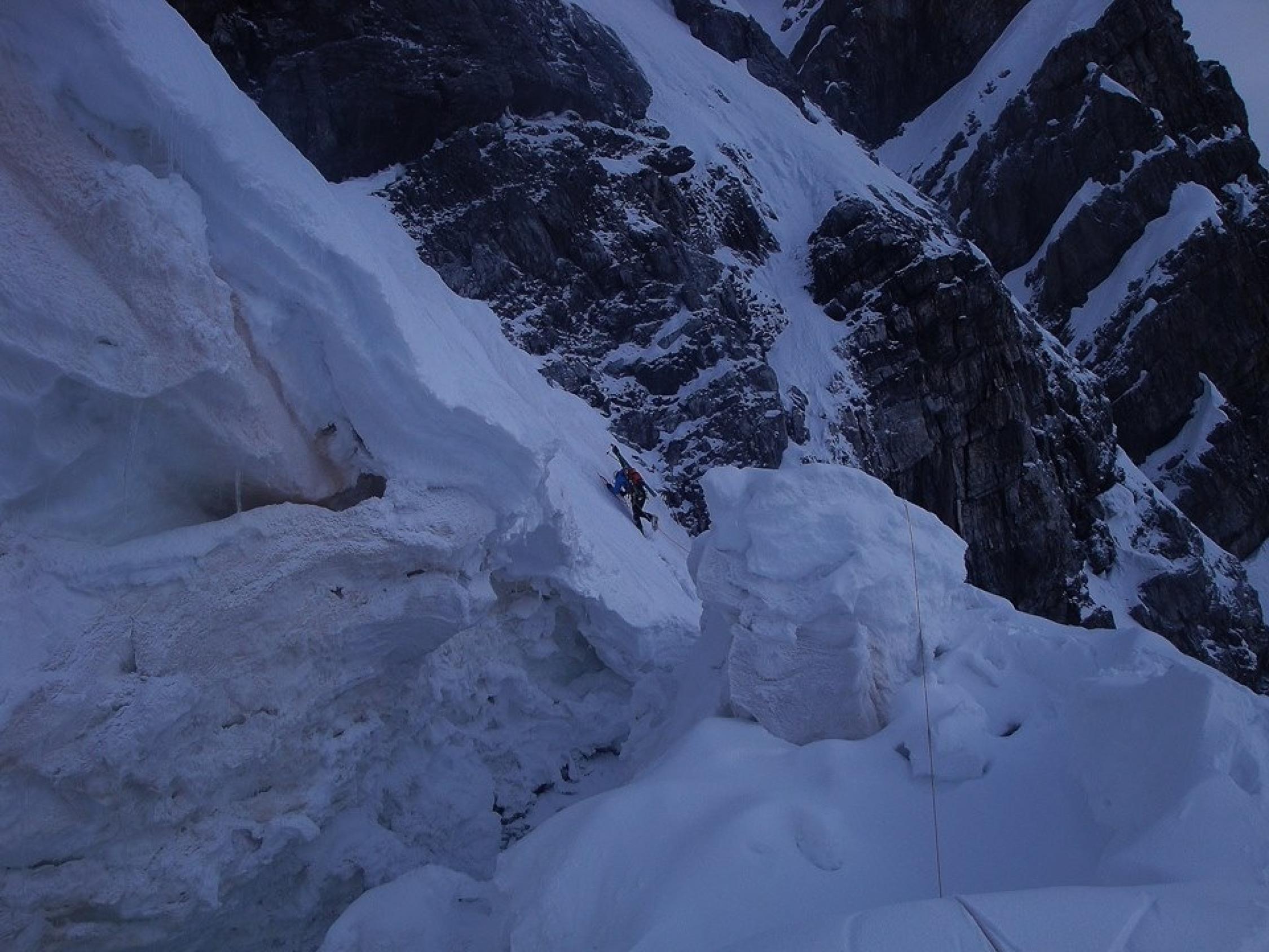 Gute Verhältnisse! In der Rinne durchgehend Trittschnee. Letzte Seillänge wie zu erwarten Blankeis! Einstiegsbereich recht kompliziert aufgrund der 3 großen Randspalten.