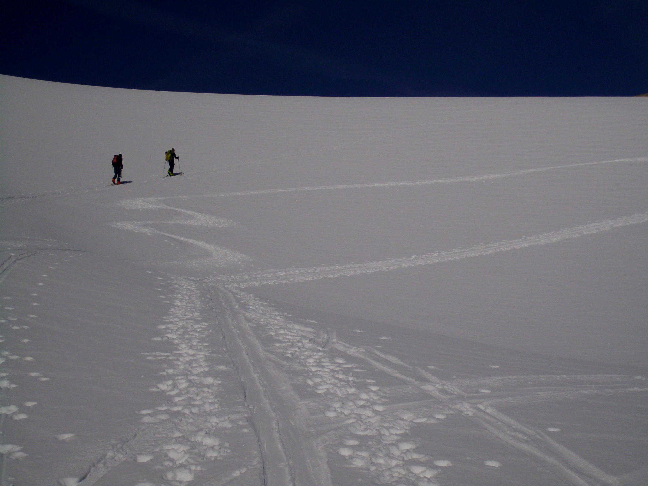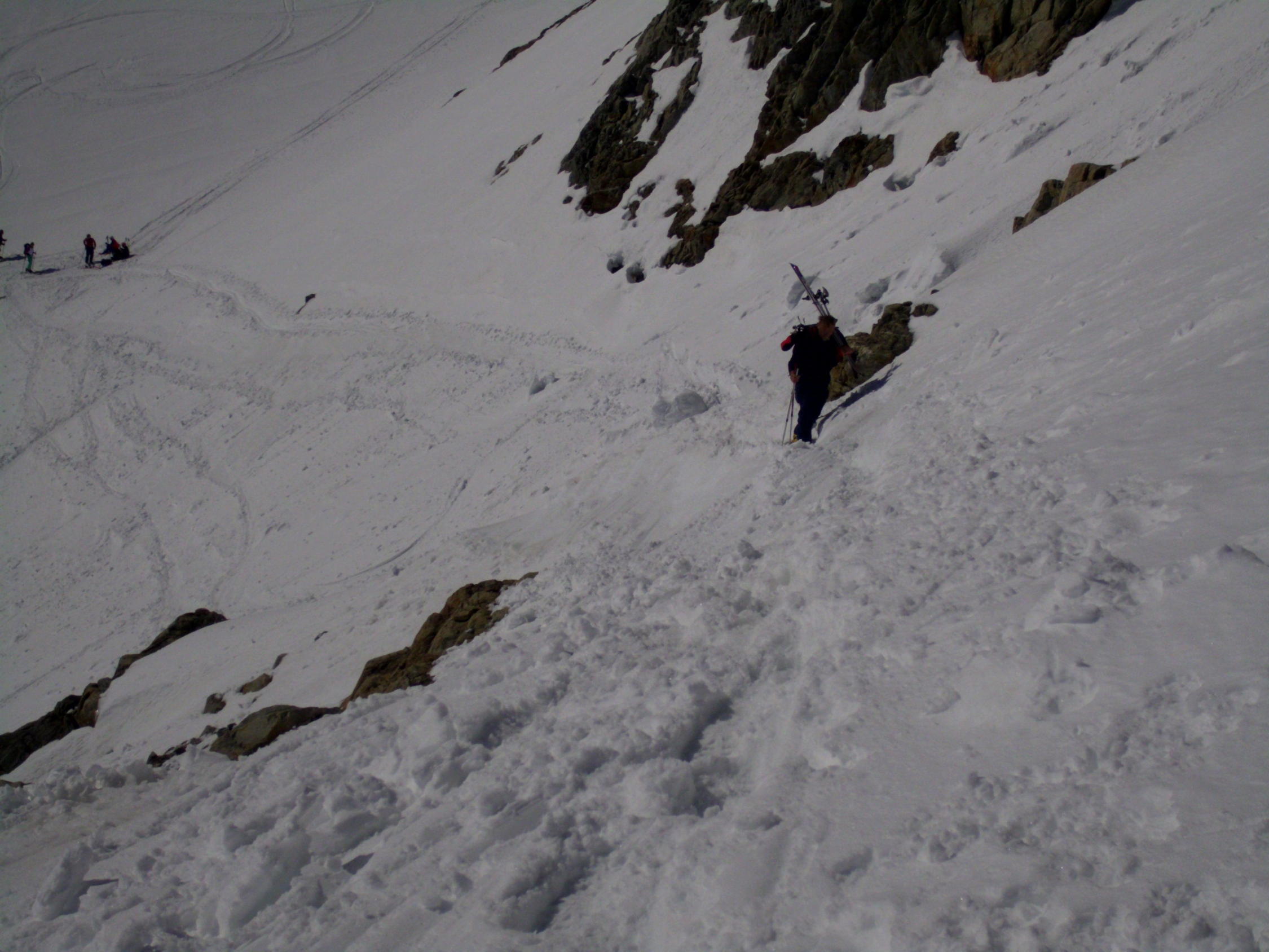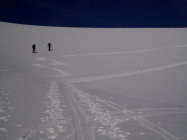 Am Morgen bis Umpol hart gefroren, ab ca 2100m augeweichte Spur, heute ohne Harscheisen machbar.
