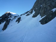 Im steilen Couloir hinauf zum Täligrat sind mehrere Spuren falscher Aufstiege zu erkennen. Der richtige ist, wenn man sich, von unten gesehen, ganz links hält.