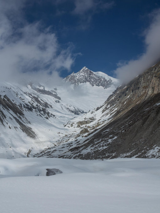 Nicht mehr viel Schnee im Übergangsbereich vom Aletsch- zum Mittelaletschgletscher. Direktaufstieg zum Mittelaletschbiwak am östlichen Gletscherrand jetzt noch möglich, bald besser die unterste Seraczone links umgehen. Am Grat guter Trittschnee, der Vorgipfel lässt sich gut südlich umgehen. Am NW Grat zum Gipfel kurze Blankeisstelle, braucht aber keine Sicherungsmittel.