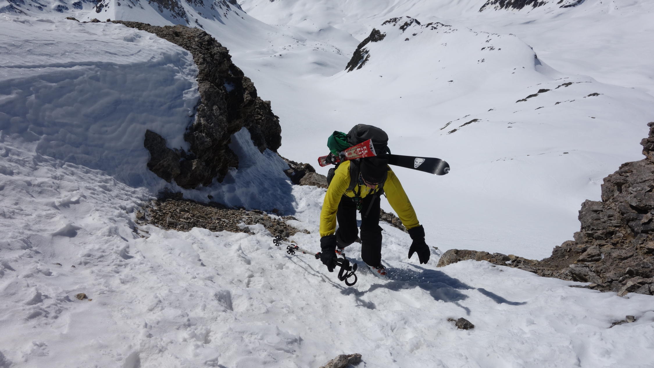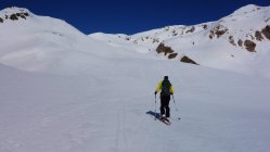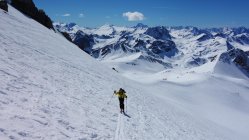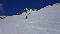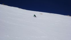 Start um 8.30 Uhr an der Julierpassstrasse bei Traumwetter und -1°. Abfahrt vom Gipfel um 12.30 Uhr. Es liegt etwas Neuschnee, der sich im oberen Teil noch nicht vollständig in Sulzschnee umgewandelt hat. Von oben bis unten weich, aber sehr gut zu fahren ohne einzubrechen.
