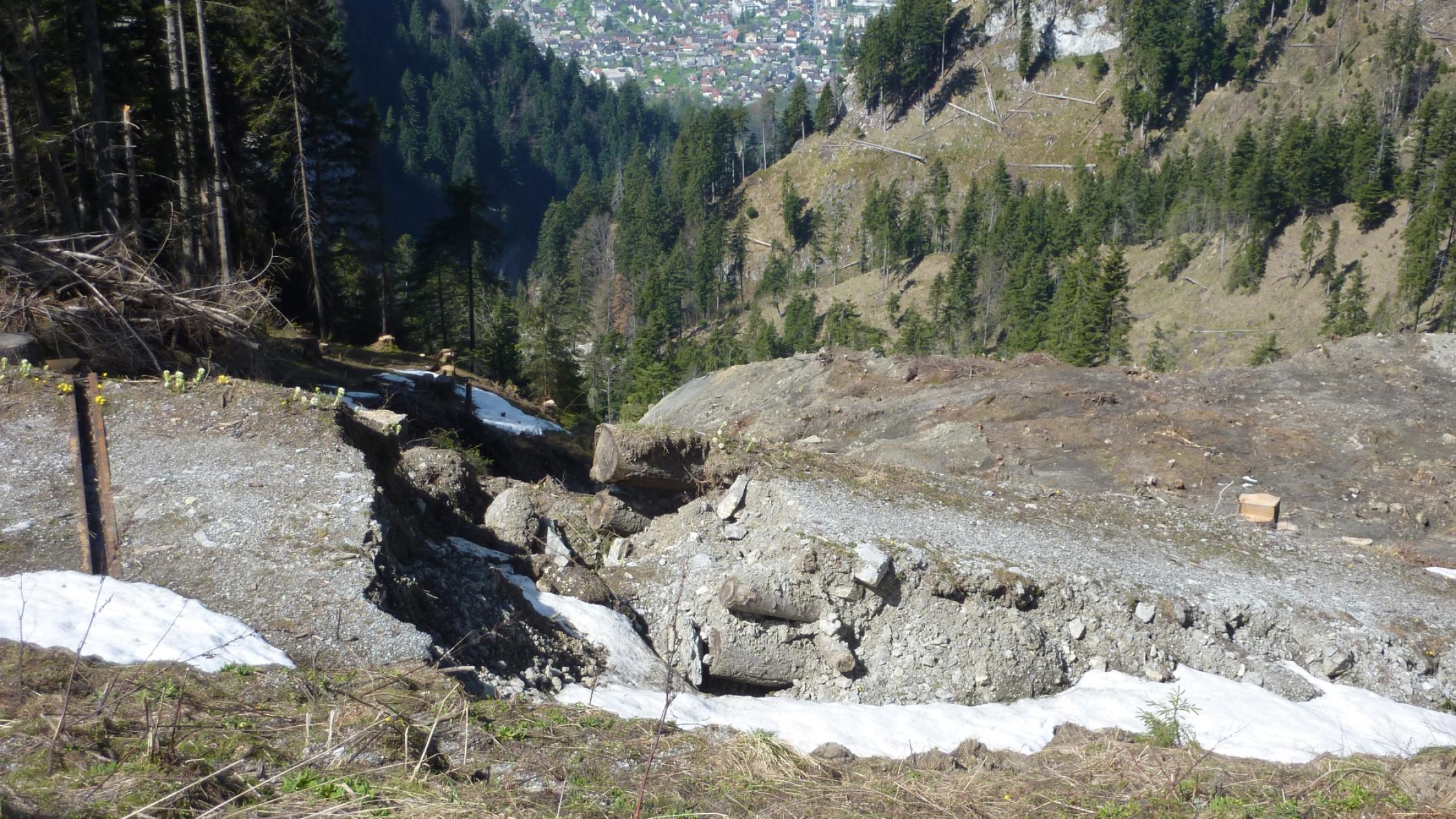Zur Hohe Kugelalpe liegt noch teilweise Schnee auf der Strasse, also kurzes Stück schieben, besser tragen (25' 80 Hm). Ab hier offizielles Ende der Bikestrecke. Bis auf Kühboden kann noch gefahren werden. Ab Briedler sind im vergangenen Jahr große Erdrutsche abgegangen, die Stasse und Wege versetzt haben und deshalb gesperrt wurden. Die Schäden sind noch nicht behoben, doch kann man bei trockenem Wetter passieren.