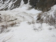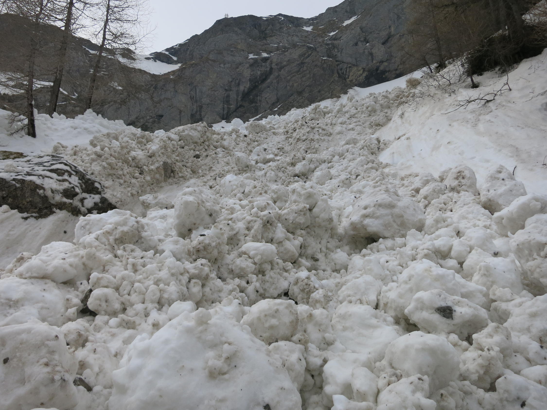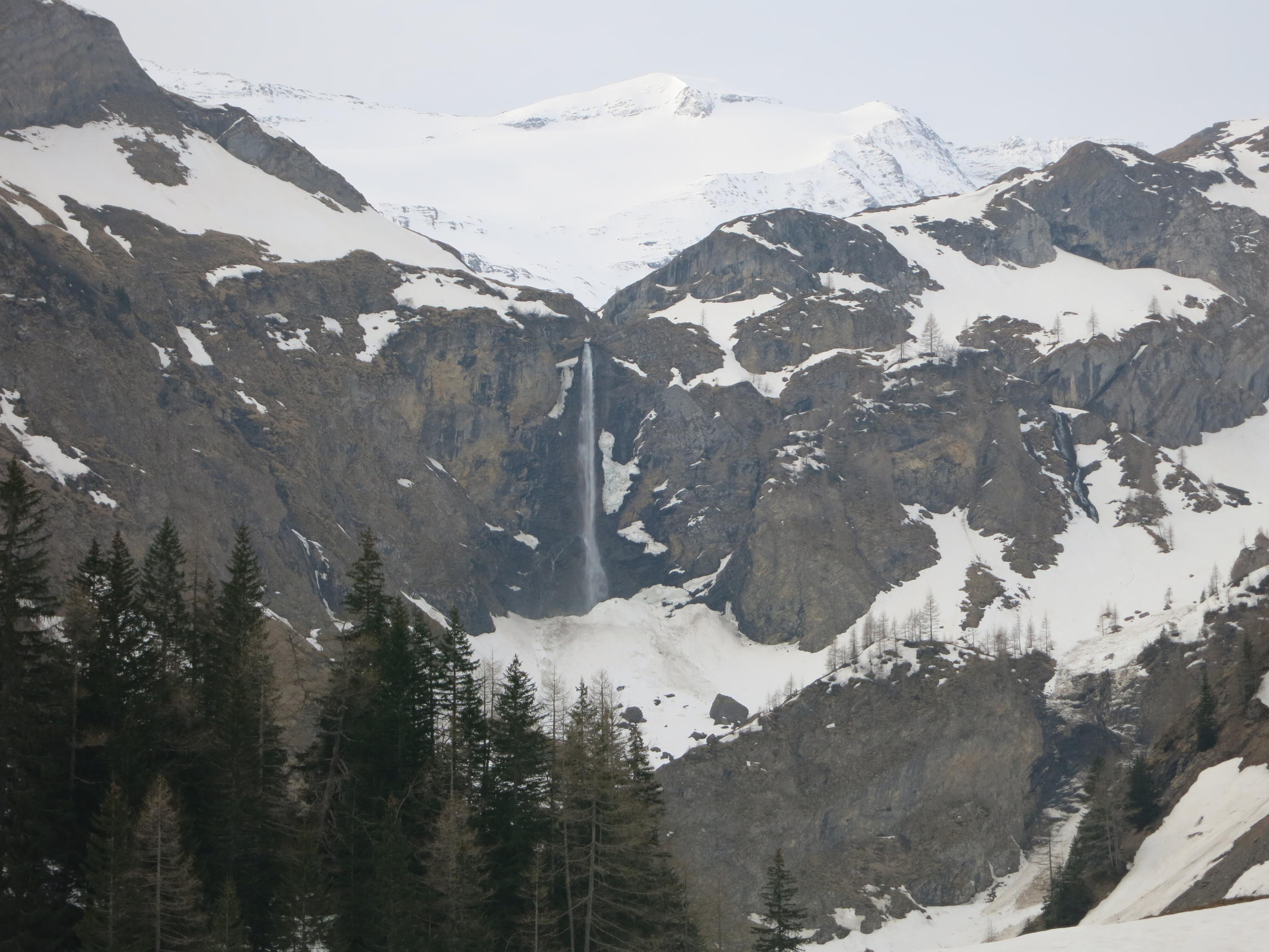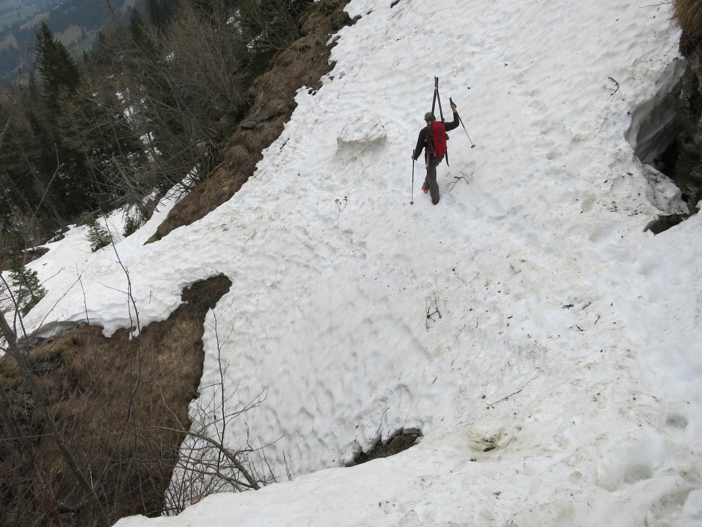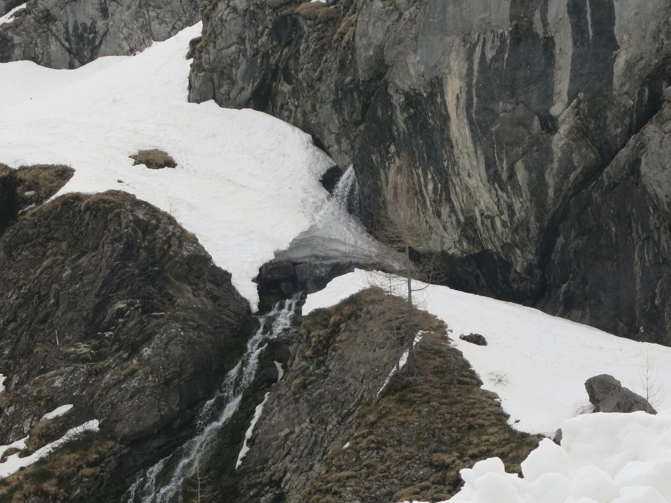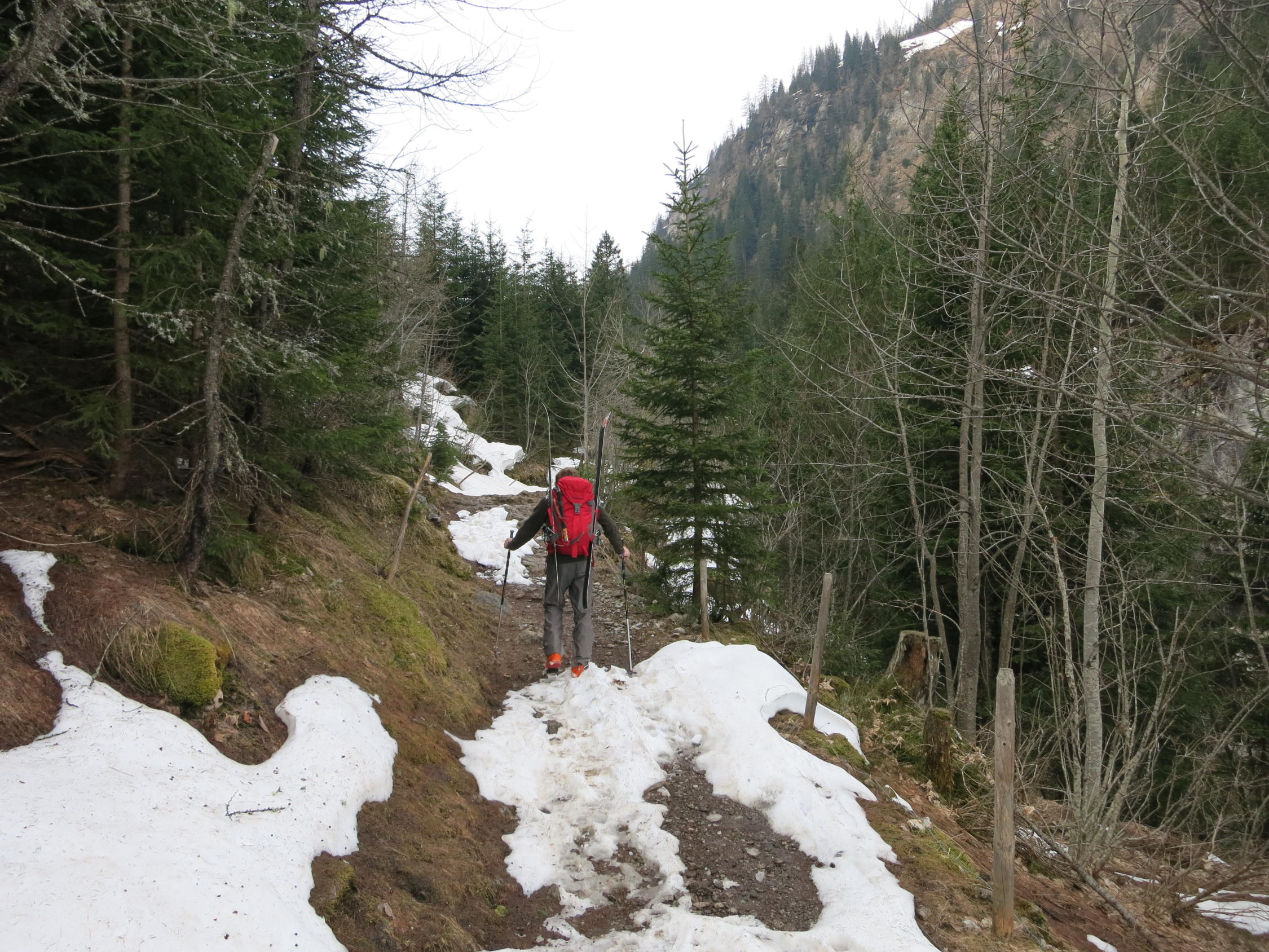 Im Wald nach dem Parkplatz aper bis auf kurze Strecken. Die kurze Traverse beim ersten Wasserfall ist exponiert aber beim weichen Schnee huete problemlos. Nach der Brücke können die Ski angezogen werden. Grosser Lawinenkegel am Nüwe Berg. Wir haben diesen teilweise überschritten, dann doch aufgrund der Wärme, beschlossen hier umzudrehen. Es war um 7 Uhr schon 10 Grad warm und wir wollten bei der Abfahrt nichts riskieren. Auch die Traverse am Geltenschuss sah nicht ganz trivial aus auf die Entfernung. Es muss kälter werden für diesen Aufstieg.