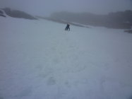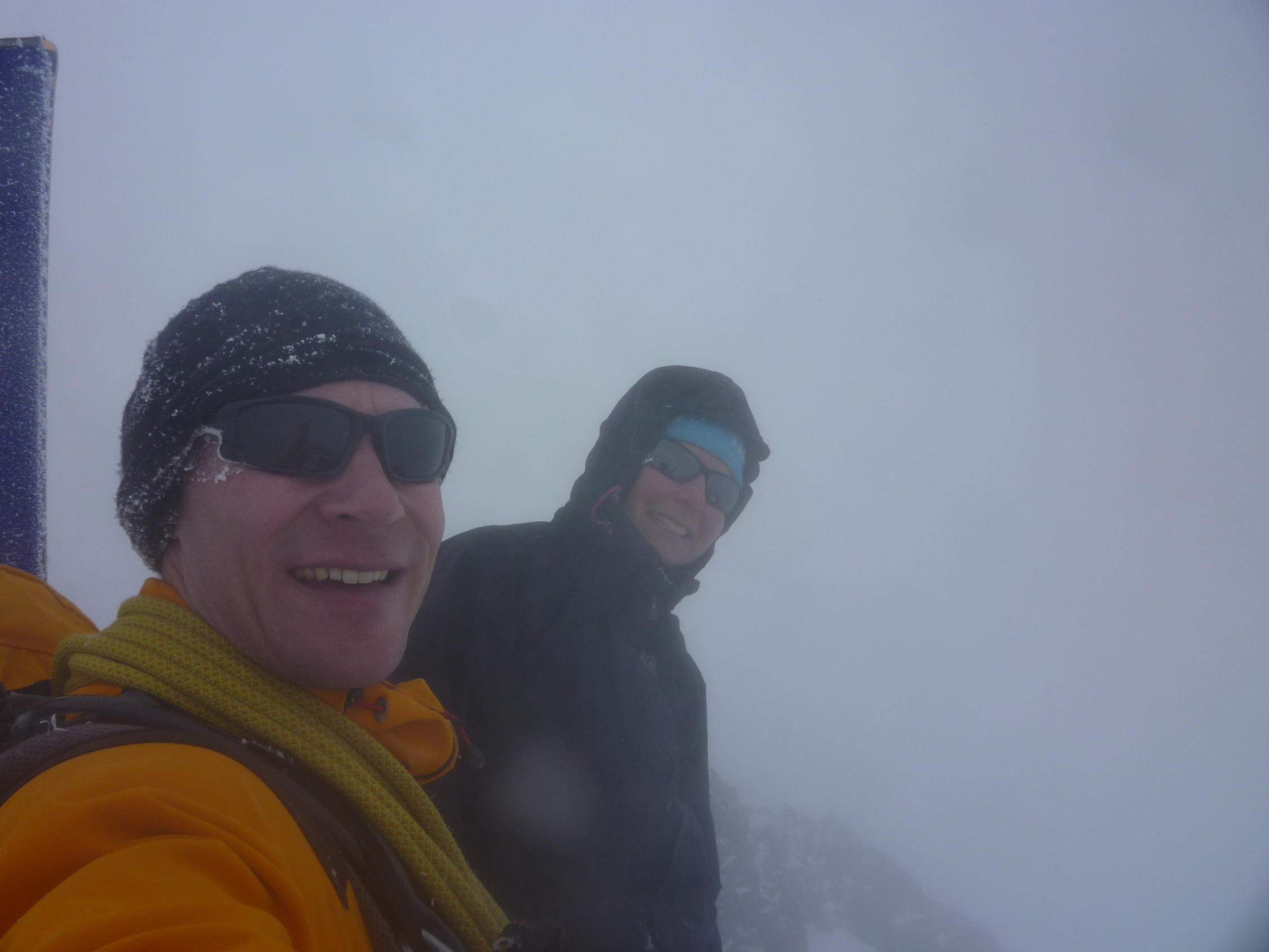 Anfangs nur schlechte Sicht, später erst schwacher, dann starker Graupelschauer. Wenig Blankes, vielerorts guter Trittfirn, oft aber auch bereits im Übergang zu Blankeis. Wächten erfordern Aufmerksamkeit, auf der Route verstecken sich auch einige Spalten.