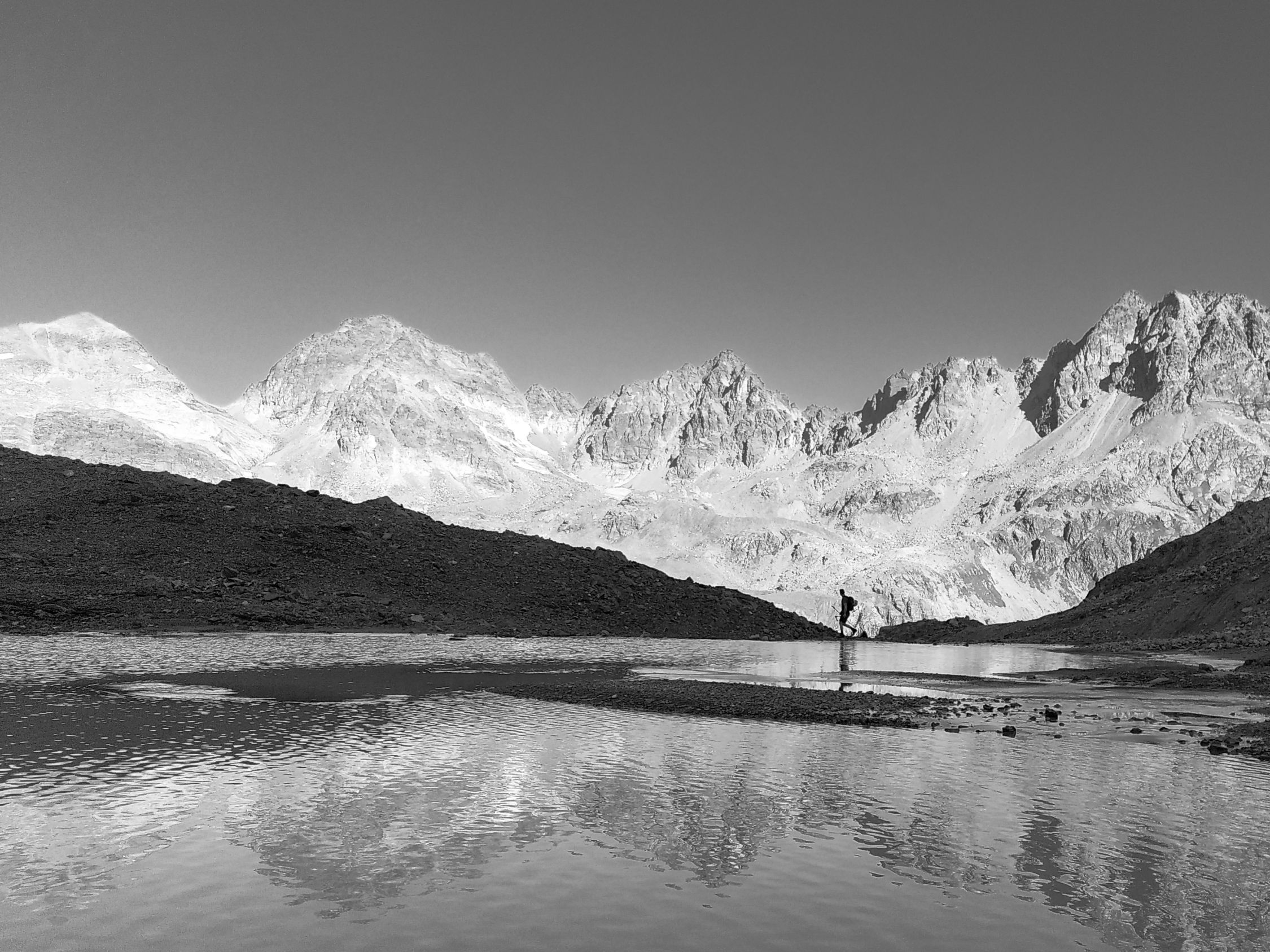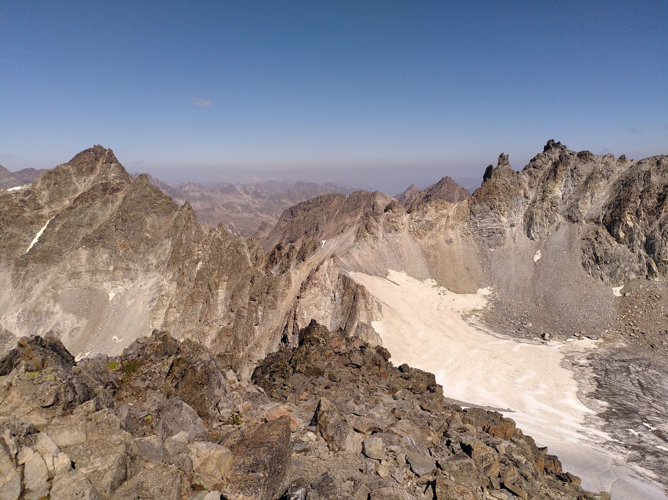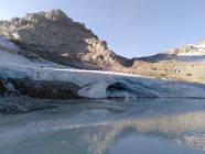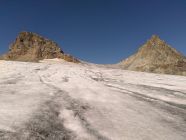 Gletscher war weitgehend aper. Der stark zurückgegangene Gletscher machte das mehrmalige An- und Ausziehen der Steigeisen notwendig. Die teilweise steilen und rutschigen Schuttfelder machen die Route zudem recht kräftezährende.