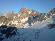 Bürglen Nordflanke hat noch viel Schnee. Im NW Coulouir am Gantrich hingegen kein Schnee in der unteren Hälfte (siehe Foto).