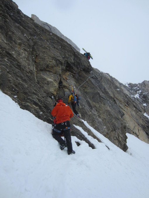 Der Aufstieg von Süden zum Tüfelsjoch ist momentan nicht für Jedermann, da es im unteren Bereich eine glatte Platte hat und die Tritte erst über 5m ab Boden beginnen.