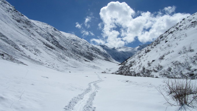 Das wird der letzte Pulver in dieser Saison am Schneeberg gewesen sein. Vermutlich wird auch ein Aufstieg ohne Tragepassagen nicht mehr möglich sein. Schon bei der Abfahrt am Nachmittag gab es apere Stellen im Vergaldener Tal.