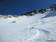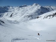 Schönes Wetter, oben windig und kühl. Die 5 - 10 cm Neuschnee sind verblasen. Teils windgepresst, stellenweise blank, auch einige schöne pulverige Mulden. Bei der Abfahrt um 10 Uhr wurde der Schnee unten schon feucht.