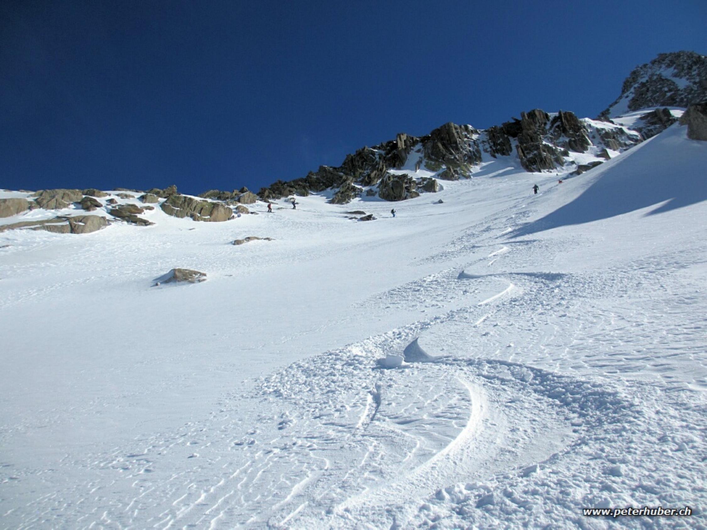 Der Einstiegshang hat derzeit noch genügend Schnee. Einige Stellen sind nur noch knapp eingeschneit. Danach tolle Tourenverhältnisse. Im Gipfelhang schauen etliche grosse Steine heraus, die für Abfahrt umfahren werden können. Vor dem Grat hat es soviel Schnee wie seit langem nicht mehr, was den Aufstieg auf den Grat einfacher macht. Auf dem Grat etwas schwierig da es keinen Trittschnee hat, nur einige Zentimeter lockerer Pulverschnee.