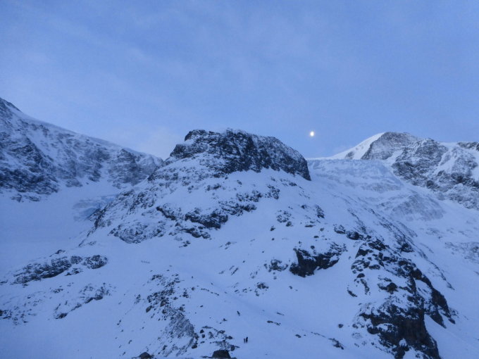 Von $teingletscher weg durchgehend Schnee. Spur war hart aber griffig. Im Gletscherabbruch gute Verhälnisse. Spalte in der Mitte gut sichtbar.