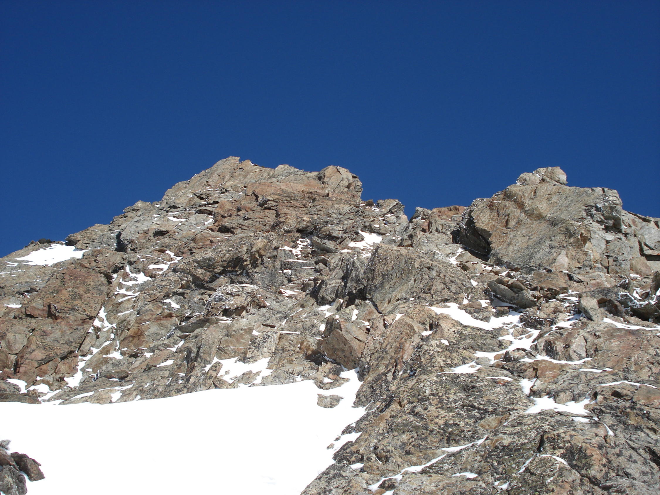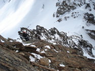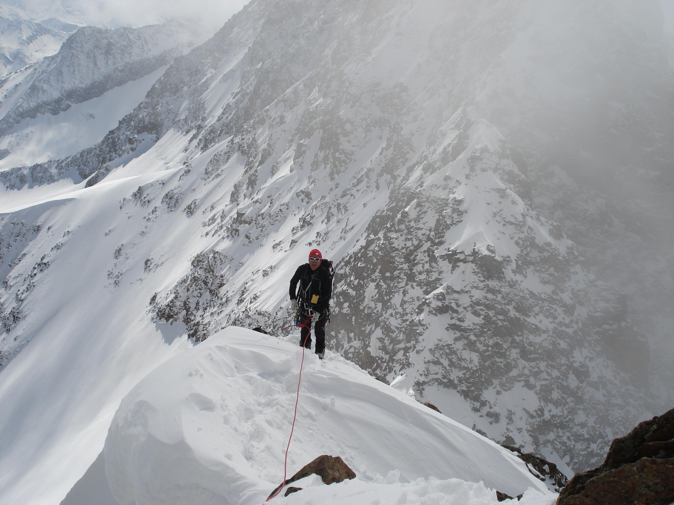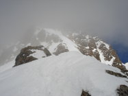 viel Spurarbeit bis zum Skidepot, 10-30 cm. Neuschnee, am Schluss klebte er auch noch an den Fellen, Aufstieg Gipfelgrat zuerst schön trockener Fels,dann immer mehr Neuschnee am Grat, es zogen auch noch Nebelschwaden auf.
