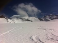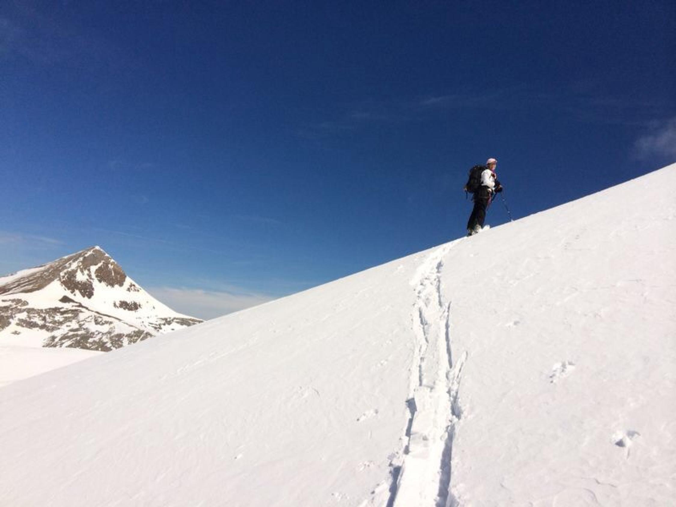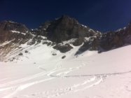 Im unteren Bereich wird man die Skis weiter hinauf tragen müssen. Oben auf dem Gletscher sollte es noch einige Tage gut bleiben. Im Gipfelbereich waren die Verhältnisse top, die weitere Entwicklung ist jedoch v.a. abhängig vom Wind und eingeblasenem Schnee (Lawinenbulletin für Gipfelaufbau, Schlussaufstieg beachten).