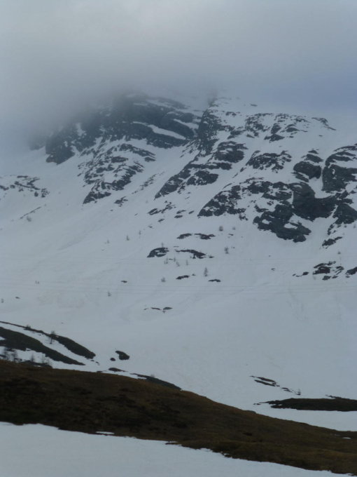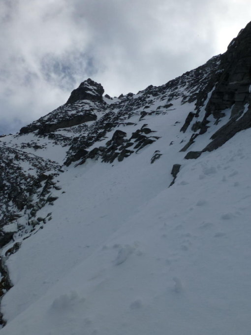 Morgens Nebel und Wolken, dann sonnig, später wieder Quellwolken. Schnee ab Hospiz bis ca. 2400m faul, dann angefroren. In der NW-Flanke zuerst Trittschnee, dann einbrechender Bruchharsch. Im Mixedteil einige kurze Passagen mit dünner Schneeschicht auf griffarmen Felsen. In der SW-Flanke Sulz, im NW-Couloir zuerst tragend, dann einbrechend.