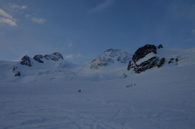 Bei der Abfahrt unterschiedliche Schneeverhältnisse, von kompaktem Pulver ganz oben über leichten Bruchharsch und festen zerfahrenen Schnee am Gletscher bis Sulz Richtung Hütte. Nicht wirklich genussvoll, aber fahrbar. Wetter nach Auflösung morgendlicher Nebelreste bis Mittag sonnig und windstill, dann Quellwolken von Süden und bei der Abfahrt etwas diffuse Sichtverhältnisse.