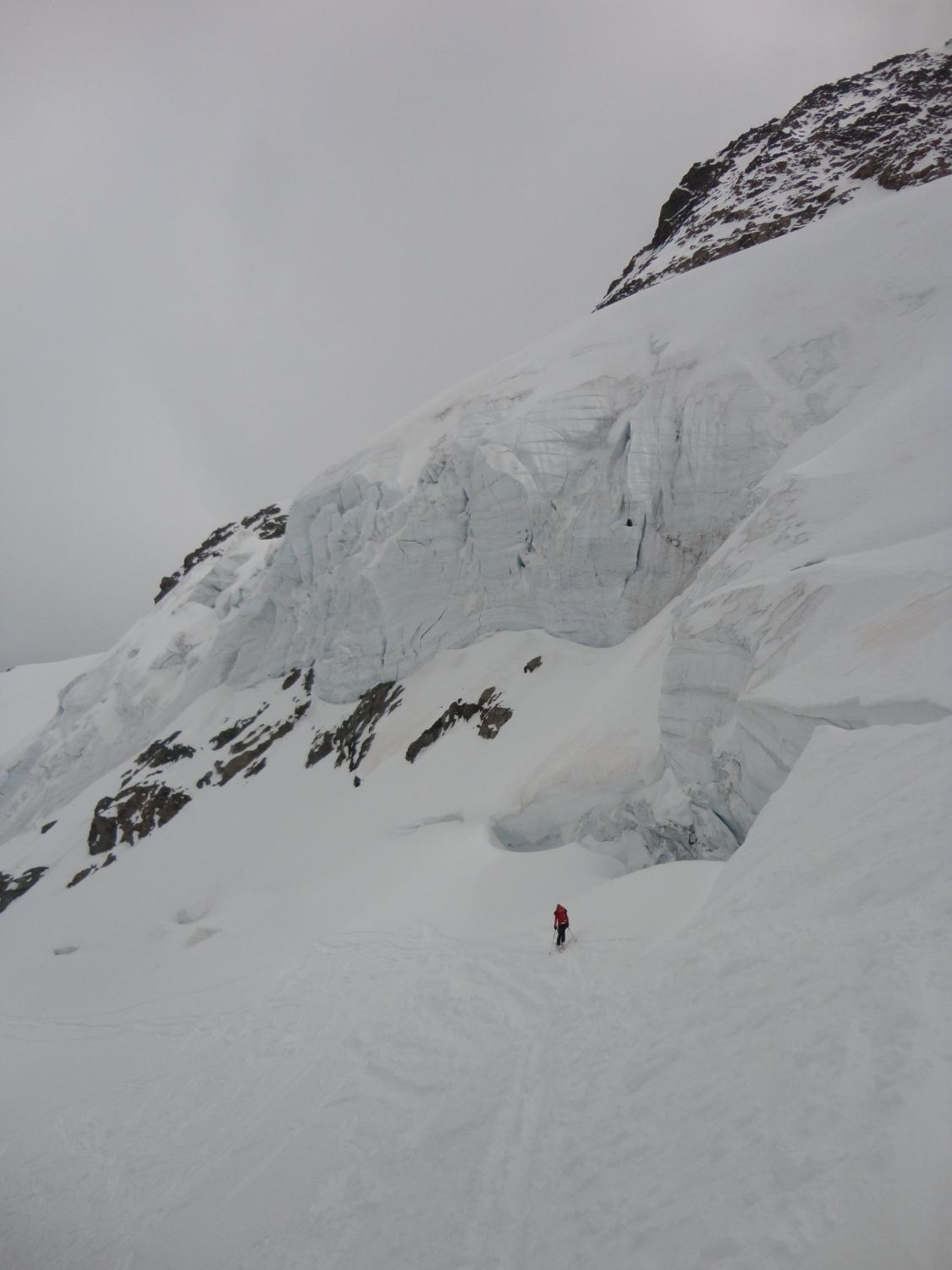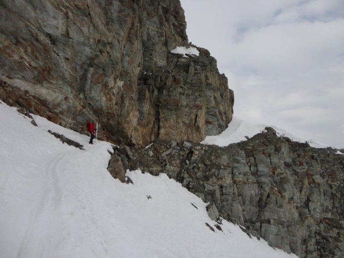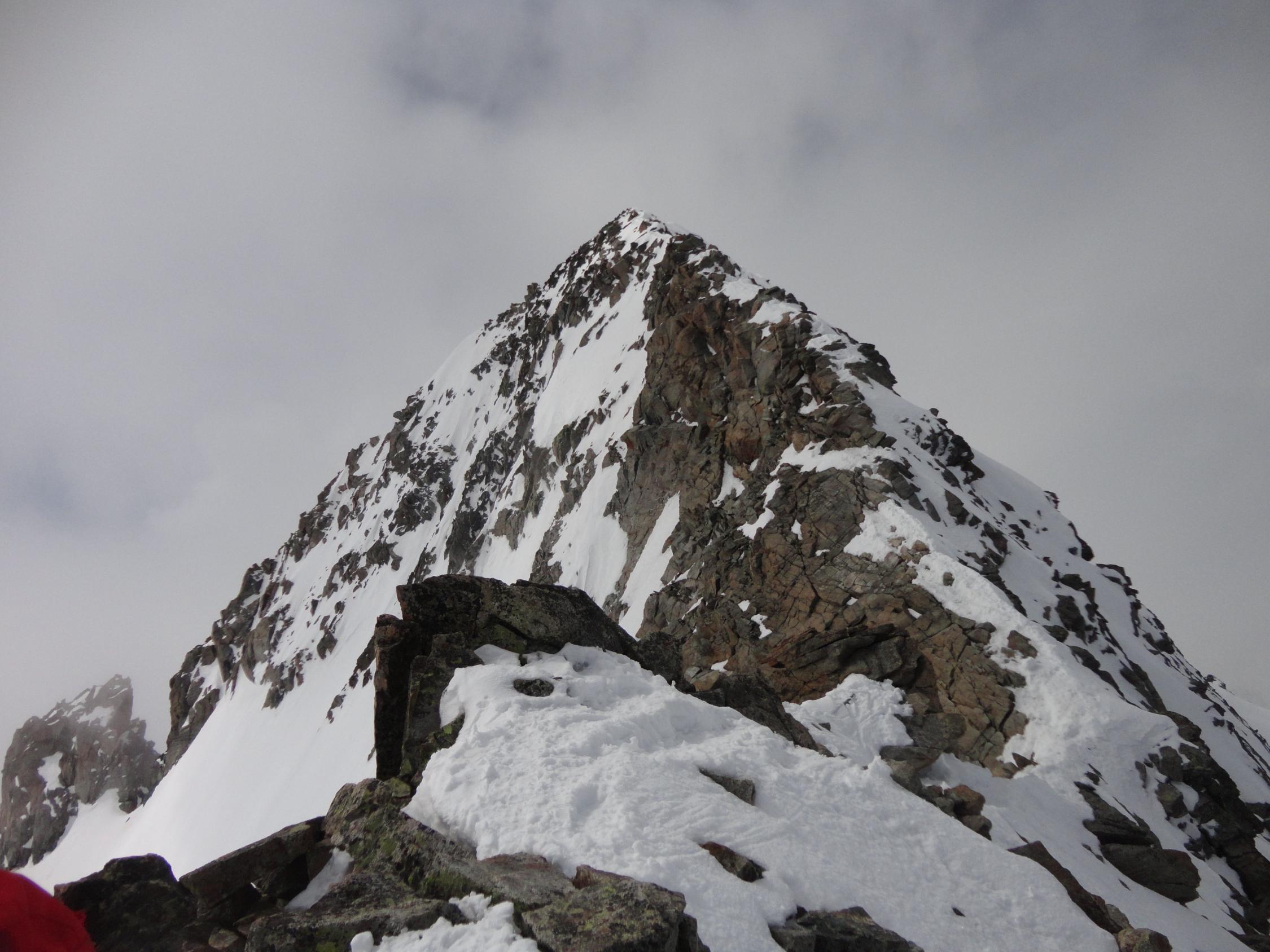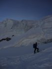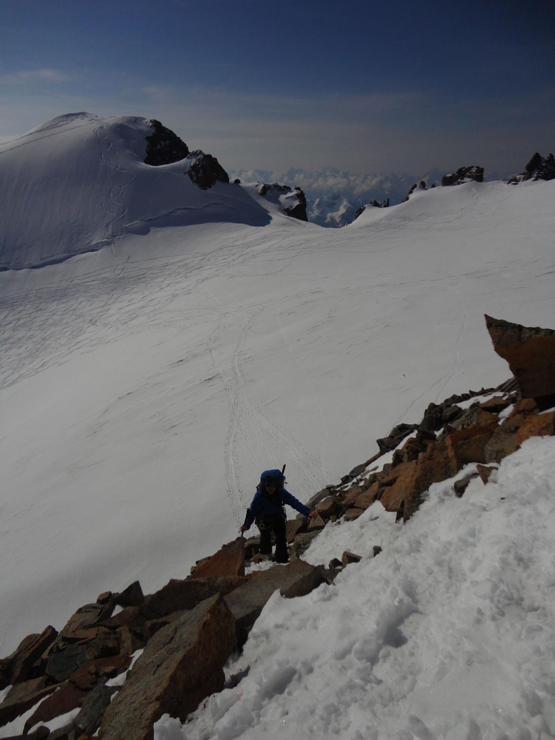 Gletscher sehr gut eingeschneit und Spaltenzonen zur Zeit problemlos zu queren. Nach nächtlicher Abstrahlung morgens alles fest. Der kombinierte Gipfelgrat ist technisch leicht (wenige IIer-Stellen), aber schmal und exponiert. Pickel und Steigeisen empfehlenswert. Wir sind vom Vorgipfel über den Grat zurückgestiegen, die alt. Abseilstelle in´s Firncouloir dürfte max. 15 m betragen.