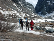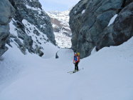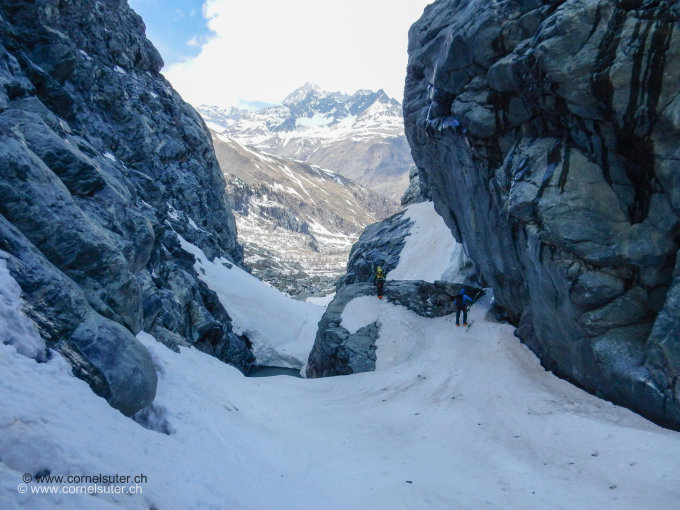 Die Schlucht war noch gut zu befahren, teilweise dünne Schneebrücken mit Rissen, wenn die Richtige Schneebrücke nicht hält dann ist ein Sturz in den Bach nicht zu verhindern, auch würde es knapp für die Abfahrt, weil dann ein grosses Stück fehlt. In der Schlucht müssen die Ski kurz über einen Felsen getragen werden.