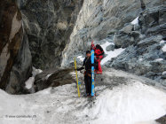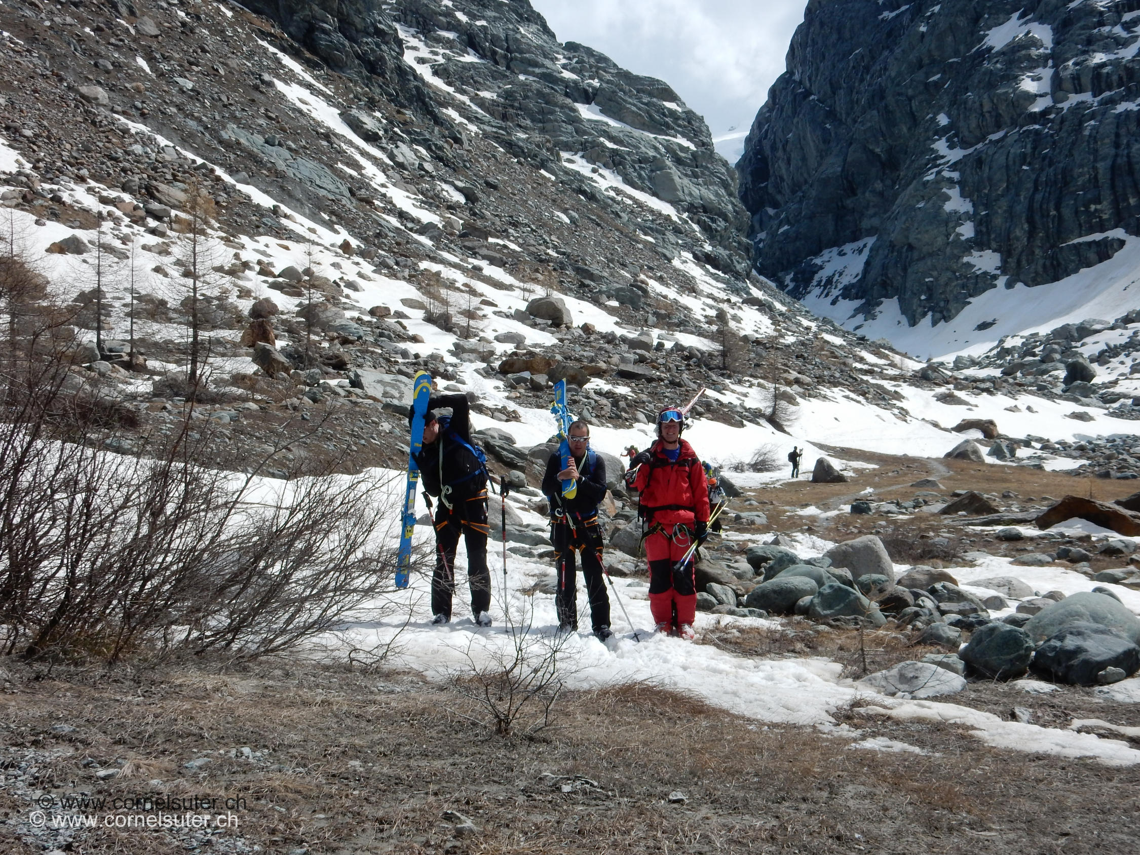 Nach der Schlucht ab ca 2060m müssen die Ski getragen werden, jedoch kann man später noch ein grosses Schneefeld befahren werden bis zum Stauwehr Pt.2007, dann noch ein paar Meter zu fahren. Anschliessend alles tragen bis hinauf zur Piste, abfahrt nach Zermatt noch möglich, aber sehr nasser und weicher Schnee.