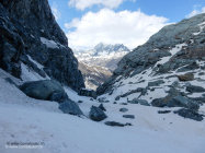 Vom Gipfel abgefahren bis unterhalb vom Biv Rossi e Volante, hier für den Aufstieg zum Schwarztor nochmals kurz die Felle montiert.
