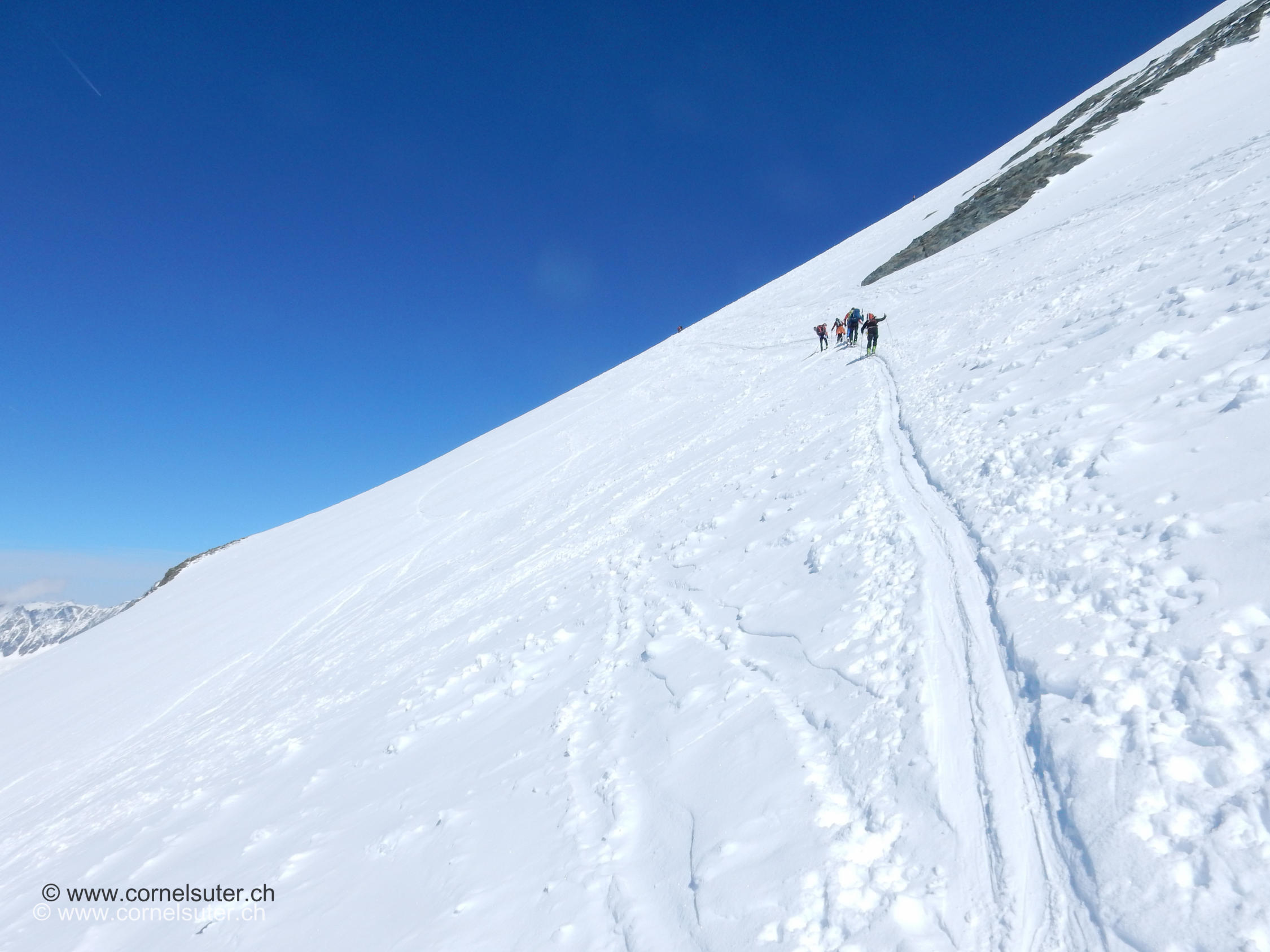 Ab Klein Matterhorn gute Aufstiegsspur, Harscheisen nicht gebraucht. Auf dem Breithornplateau hatte es ca 15cm Pulverschnee auf Hartschnee. In der Flanke ziemlich verfahren und Teilweise hart.