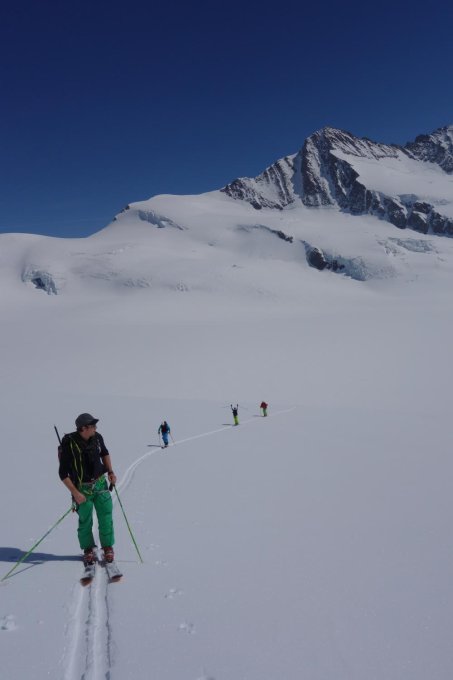 Kann kaum besser werden; Statt unter dem Eisbruch hochzugehen fährt man besser vom Ewigschneefeld noch 200 Meter tiefer ab und steigt erst dort durch einen Hang hoch zum Skidepot am Trugberg.