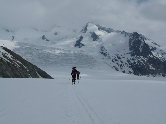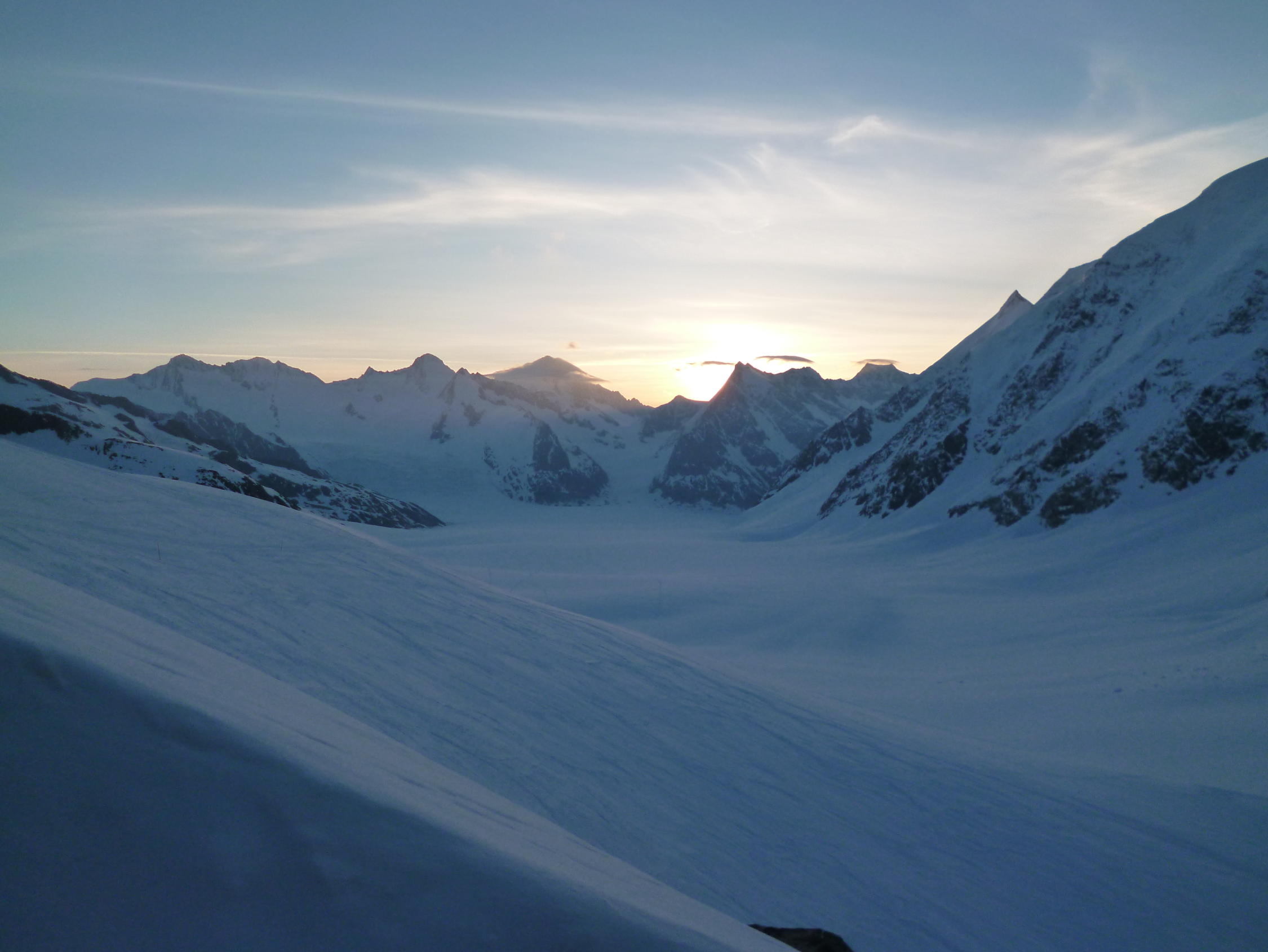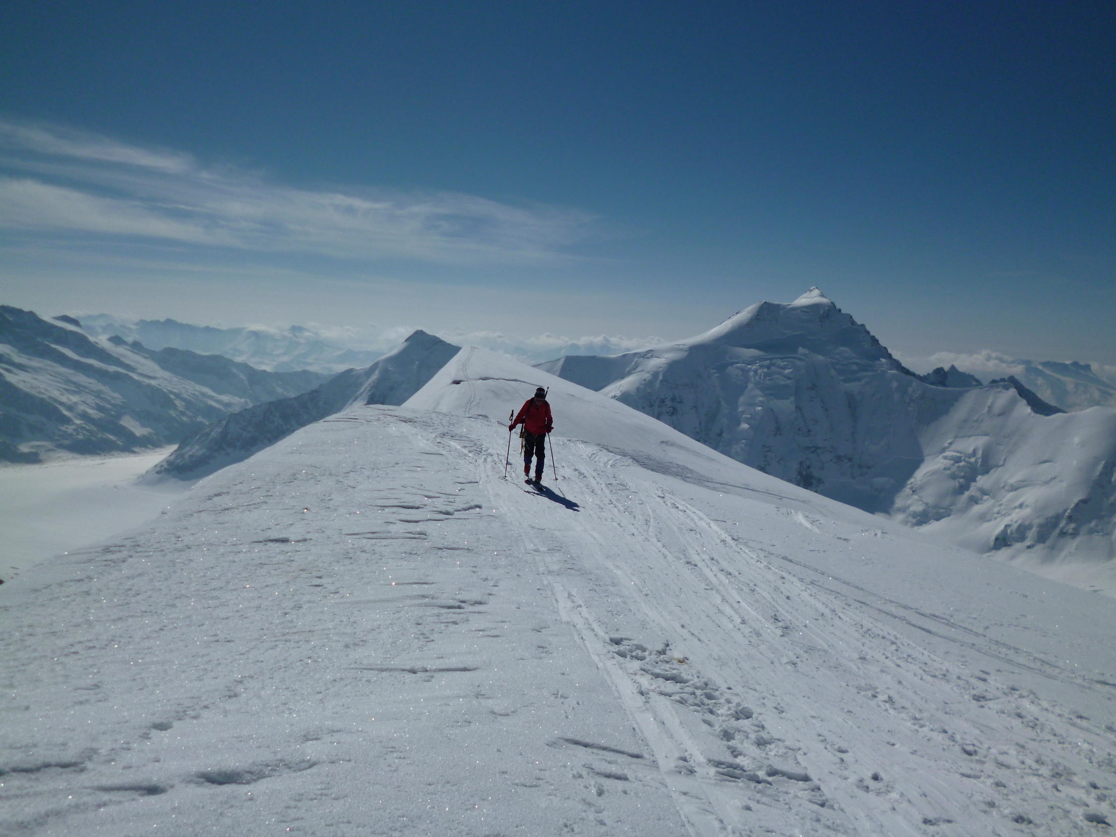 Zusammen mit dem Weg vom Jungfraujoch zur Hollandiahütte (am Vortag) ergibt diese Tour total ca. 1200 m Aufstieg und knapp 3000 m Abfahrt. Am 25./26.4. war es von (fast) zuoberst bis (fast) zuunterst eine reine Genusstour!
