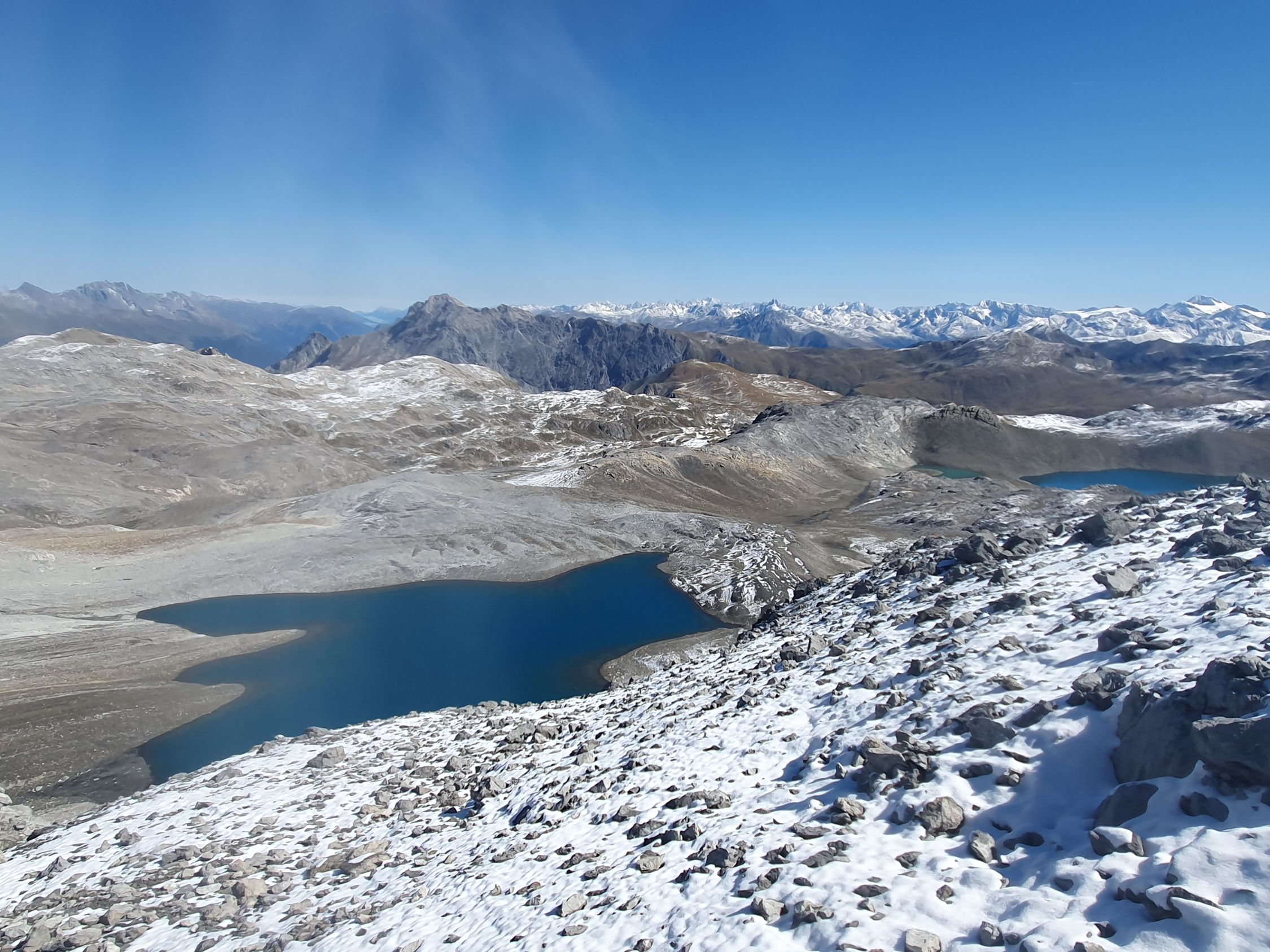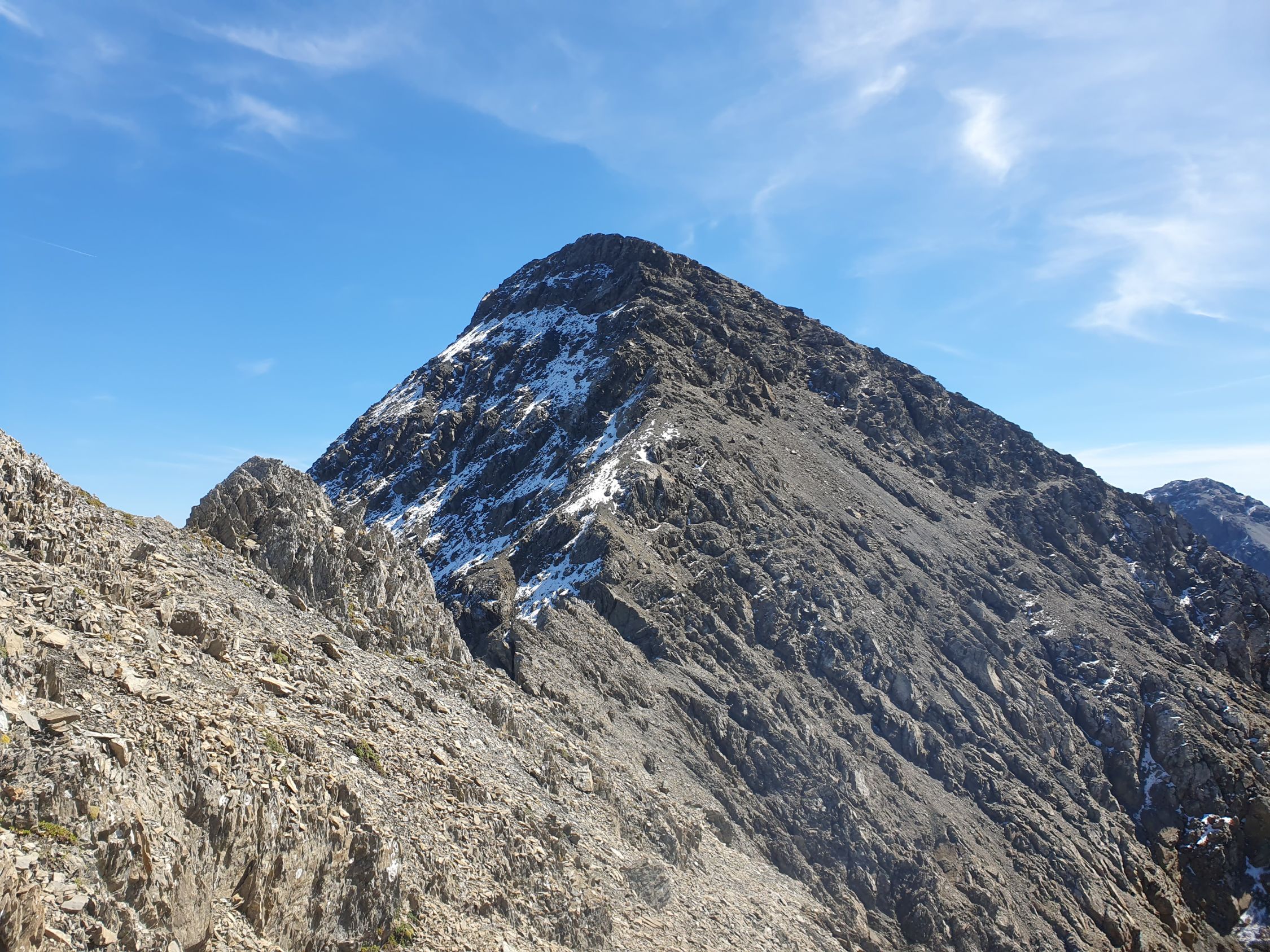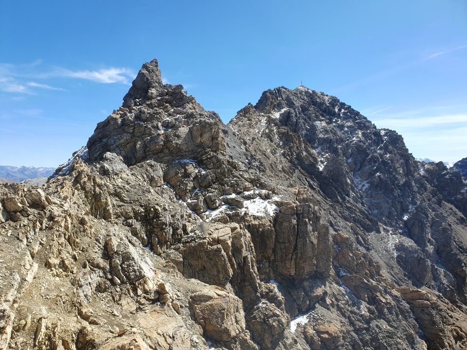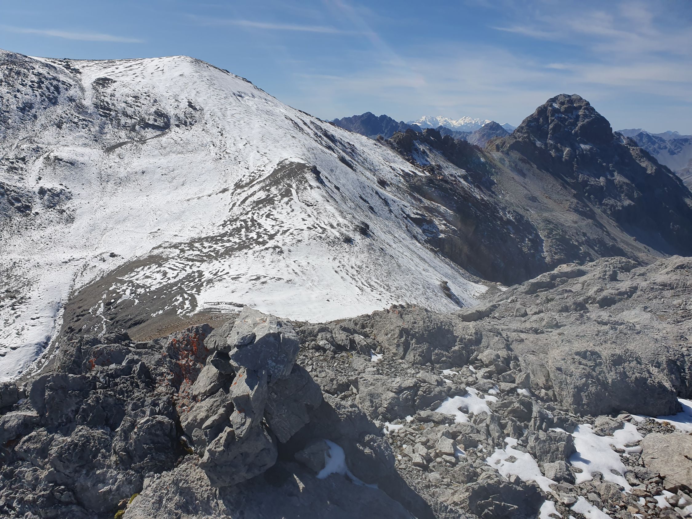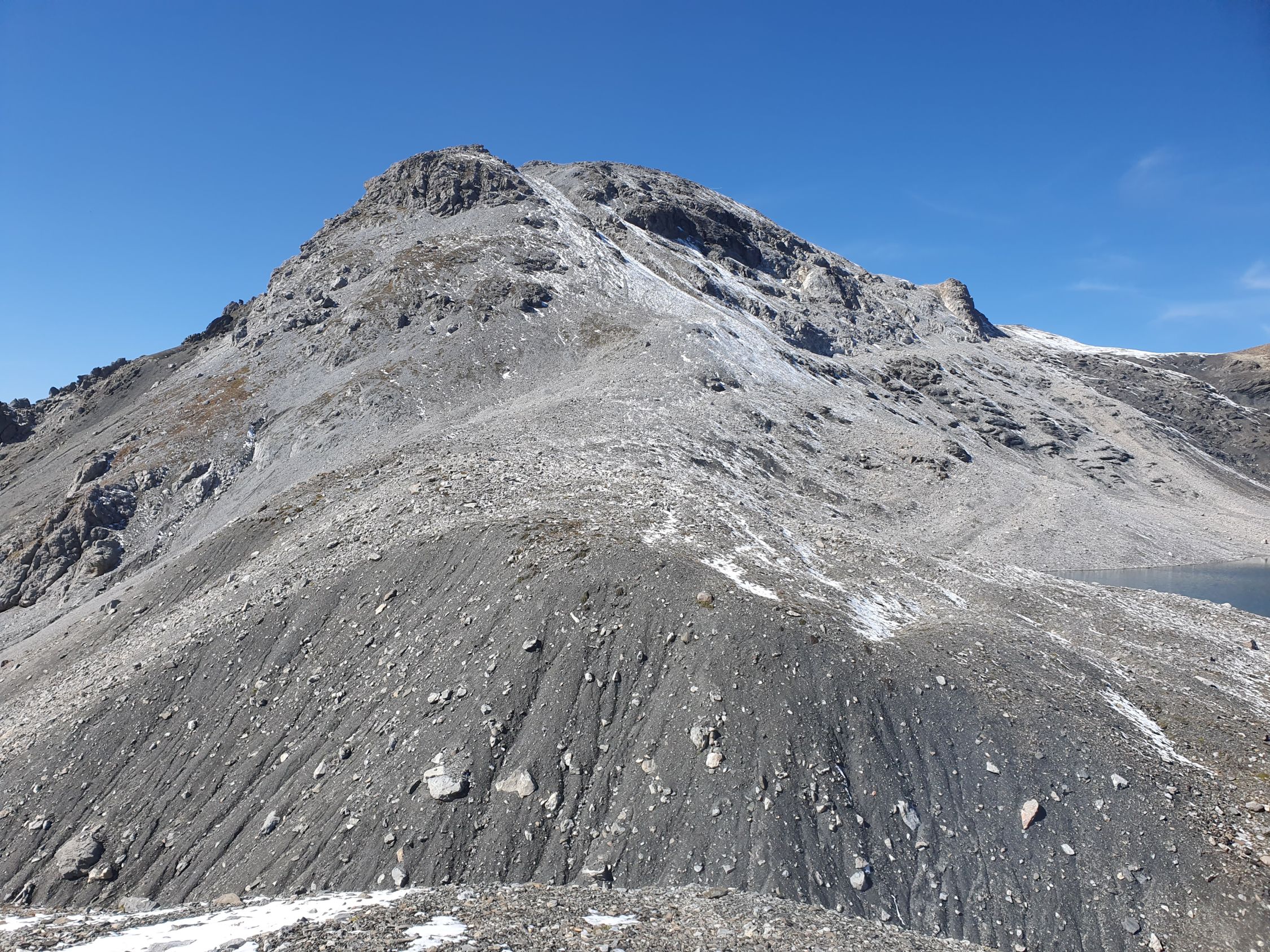 Ab P2945 umgehe ich den ersten Blockgrat auf der südlichen Seite, hier weisen ein paar spärliche Steinmänner den Weg auf. Etwa mittig vom Piz San Jon Dadaint E-Grat, wo eine riesige schräge Platte mit einem Riss den Weiterweg blockiert, steige ich wieder hoch zum Grat und traversiere scharf nördlich dieser Platte parallel unter dem Grat eine Art schrägen Couloir hoch (T5-, I+), heute mit Schnee eher ein T5+, I+ gewesen. Kurz vor dem S-Grat wechsle ich die Seite nach Süden, ein Steinmann markiert hier den Seitenwechsel, und steige da die S-Flanke hoch, zuletzt einfach auf Kies hoch zum Piz San Jon Dadaint mit einem einbetonierten IMIS- (Interkantonale Mess- und Informationssystem) Messnetz des SLF und der Kantone, von denen es schweizweit rund 180 Stationen gibt (danke Stumpi für deine Nachricht und Berichtigung, dass es sicher hier nicht um eine übliche Antenne handelt) und Stock und ohne Gipfelbuch. Hier habe ich meine halbstündige Mittagspause bei wolkenlosem Himmel genossen.