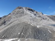 Auf einen nicht markierten, aber erkennbaren Pfad etwas rutschig über Kies und Schneereste hoch zum Piz Cotschen (T4).